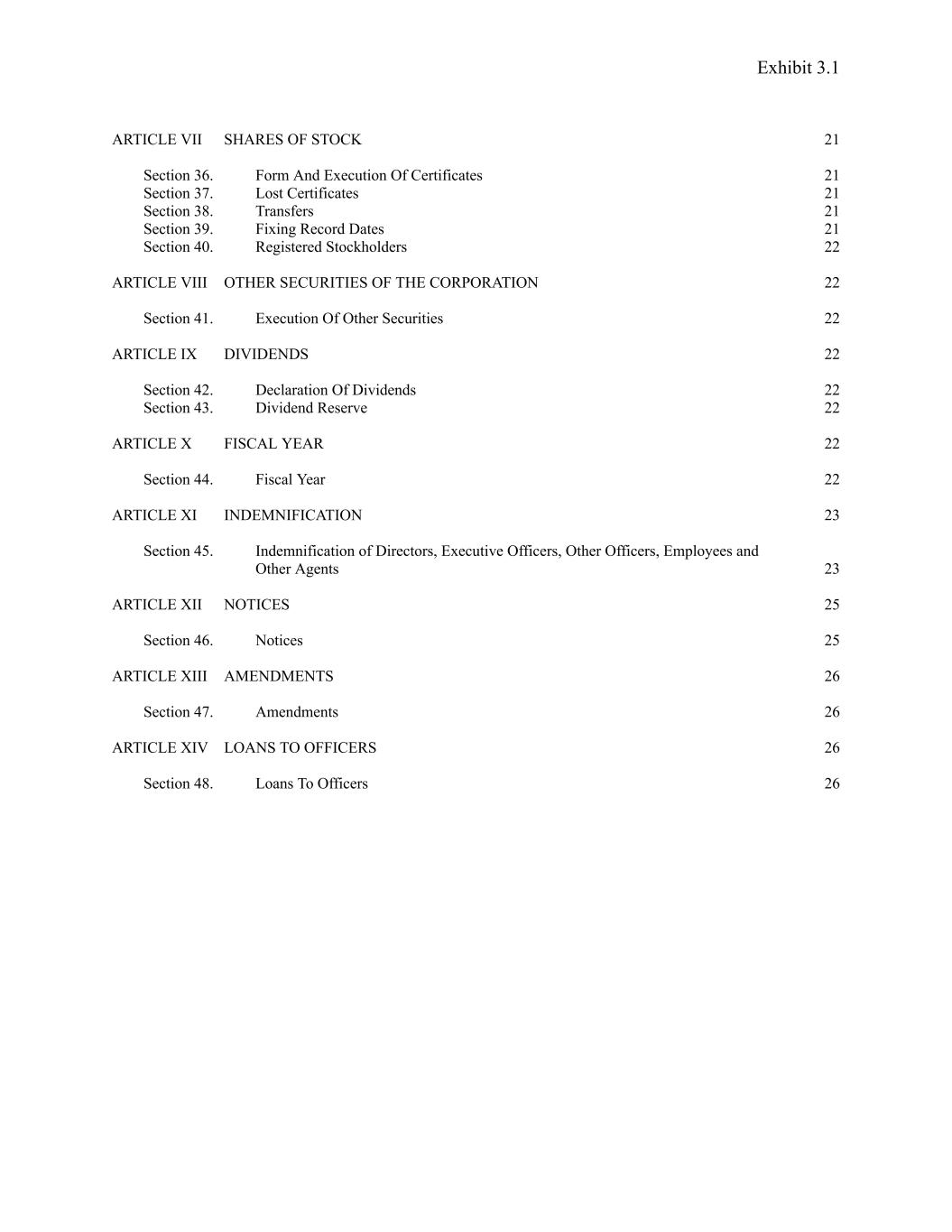 Exhibit 3.1 ARTICLE VII SHARES OF STOCK 21 Section 36. Form And Execution Of Certificates 21 Section 37. Lost Certificates 21 Section 38. Transfers 21 Section 39. Fixing Record Dates 21 Section 40. Registered Stockholders 22 ARTICLE VIII OTHER SECURITIES OF THE CORPORATION 22 Section 41. Execution Of Other Securities 22 ARTICLE IX DIVIDENDS 22 Section 42. Declaration Of Dividends 22 Section 43. Dividend Reserve 22 ARTICLE X FISCAL YEAR 22 Section 44. Fiscal Year 22 ARTICLE XI INDEMNIFICATION 23 Section 45. Indemnification of Directors, Executive Officers, Other Officers, Employees and Other Agents 23 ARTICLE XII NOTICES 25 Section 46. Notices 25 ARTICLE XIII AMENDMENTS 26 Section 47. Amendments 26 ARTICLE XIV LOANS TO OFFICERS 26 Section 48. Loans To Officers 26