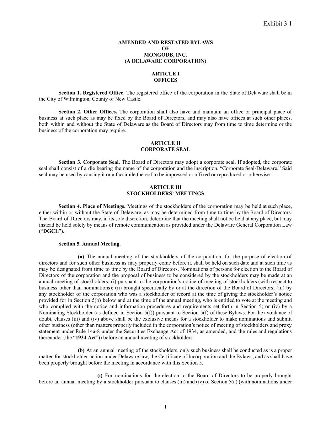 Exhibit 3.1 AMENDED AND RESTATED BYLAWS OF MONGODB, INC. (A DELAWARE CORPORATION) ARTICLE I OFFICES Section 1. Registered Office. The registered office of the corporation in the State of Delaware shall be in the City of Wilmington, County of New Castle. Section 2. Other Offices. The corporation shall also have and maintain an office or principal place of business at such place as may be fixed by the Board of Directors, and may also have offices at such other places, both within and without the State of Delaware as the Board of Directors may from time to time determine or the business of the corporation may require. ARTICLE II CORPORATE SEAL Section 3. Corporate Seal. The Board of Directors may adopt a corporate seal. If adopted, the corporate seal shall consist of a die bearing the name of the corporation and the inscription, “Corporate Seal-Delaware.” Said seal may be used by causing it or a facsimile thereof to be impressed or affixed or reproduced or otherwise. ARTICLE III STOCKHOLDERS’ MEETINGS Section 4. Place of Meetings. Meetings of the stockholders of the corporation may be held at such place, either within or without the State of Delaware, as may be determined from time to time by the Board of Directors. The Board of Directors may, in its sole discretion, determine that the meeting shall not be held at any place, but may instead be held solely by means of remote communication as provided under the Delaware General Corporation Law (“DGCL”). Section 5. Annual Meeting. (a) The annual meeting of the stockholders of the corporation, for the purpose of election of directors and for such other business as may properly come before it, shall be held on such date and at such time as may be designated from time to time by the Board of Directors. Nominations of persons for election to the Board of Directors of the corporation and the proposal of business to be considered by the stockholders may be made at an annual meeting of stockholders: (i) pursuant to the corporation’s notice of meeting of stockholders (with respect to business other than nominations); (ii) brought specifically by or at the direction of the Board of Directors; (iii) by any stockholder of the corporation who was a stockholder of record at the time of giving the stockholder’s notice provided for in Section 5(b) below and at the time of the annual meeting, who is entitled to vote at the meeting and who complied with the notice and information procedures and requirements set forth in Section 5; or (iv) by a Nominating Stockholder (as defined in Section 5(f)) pursuant to Section 5(f) of these Bylaws. For the avoidance of doubt, clauses (iii) and (iv) above shall be the exclusive means for a stockholder to make nominations and submit other business (other than matters properly included in the corporation’s notice of meeting of stockholders and proxy statement under Rule 14a-8 under the Securities Exchange Act of 1934, as amended, and the rules and regulations thereunder (the “1934 Act”)) before an annual meeting of stockholders. (b) At an annual meeting of the stockholders, only such business shall be conducted as is a proper matter for stockholder action under Delaware law, the Certificate of Incorporation and the Bylaws, and as shall have been properly brought before the meeting in accordance with this Section 5. (i) For nominations for the election to the Board of Directors to be properly brought before an annual meeting by a stockholder pursuant to clauses (iii) and (iv) of Section 5(a) (with nominations under 1