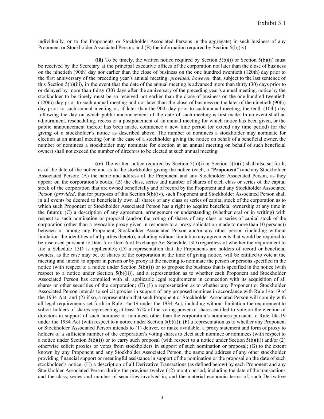Exhibit 3.1 individually, or to the Proponents or Stockholder Associated Persons in the aggregate) in such business of any Proponent or Stockholder Associated Person; and (B) the information required by Section 5(b)(iv). (iii) To be timely, the written notice required by Section 5(b)(i) or Section 5(b)(ii) must be received by the Secretary at the principal executive offices of the corporation not later than the close of business on the ninetieth (90th) day nor earlier than the close of business on the one hundred twentieth (120th) day prior to the first anniversary of the preceding year’s annual meeting; provided, however, that, subject to the last sentence of this Section 5(b)(iii), in the event that the date of the annual meeting is advanced more than thirty (30) days prior to or delayed by more than thirty (30) days after the anniversary of the preceding year’s annual meeting, notice by the stockholder to be timely must be so received not earlier than the close of business on the one hundred twentieth (120th) day prior to such annual meeting and not later than the close of business on the later of the ninetieth (90th) day prior to such annual meeting or, if later than the 90th day prior to such annual meeting, the tenth (10th) day following the day on which public announcement of the date of such meeting is first made. In no event shall an adjournment, rescheduling, recess or a postponement of an annual meeting for which notice has been given, or the public announcement thereof has been made, commence a new time period (or extend any time period) for the giving of a stockholder’s notice as described above. The number of nominees a stockholder may nominate for election at an annual meeting (or in the case of a stockholder giving the notice on behalf of a beneficial owner, the number of nominees a stockholder may nominate for election at an annual meeting on behalf of such beneficial owner) shall not exceed the number of directors to be elected at such annual meeting. (iv) The written notice required by Section 5(b)(i) or Section 5(b)(ii) shall also set forth, as of the date of the notice and as to the stockholder giving the notice (each, a “Proponent”) and any Stockholder Associated Person: (A) the name and address of the Proponent and any Stockholder Associated Person, as they appear on the corporation’s books; (B) the class, series and number of shares of each class or series of the capital stock of the corporation that are owned beneficially and of record by the Proponent and any Stockholder Associated Person (provided, that for purposes of this Section 5(b)(iv), such Proponent and Stockholder Associated Person shall in all events be deemed to beneficially own all shares of any class or series of capital stock of the corporation as to which such Proponent or Stockholder Associated Person has a right to acquire beneficial ownership at any time in the future); (C) a description of any agreement, arrangement or understanding (whether oral or in writing) with respect to such nomination or proposal (and/or the voting of shares of any class or series of capital stock of the corporation (other than a revocable proxy given in response to a proxy solicitation made to more than 10 persons)) between or among any Proponent, Stockholder Associated Person and/or any other person (including without limitation the identities of all parties thereto), including without limitation any agreements that would be required to be disclosed pursuant to Item 5 or Item 6 of Exchange Act Schedule 13D (regardless of whether the requirement to file a Schedule 13D is applicable); (D) a representation that the Proponents are holders of record or beneficial owners, as the case may be, of shares of the corporation at the time of giving notice, will be entitled to vote at the meeting and intend to appear in person or by proxy at the meeting to nominate the person or persons specified in the notice (with respect to a notice under Section 5(b)(i)) or to propose the business that is specified in the notice (with respect to a notice under Section 5(b)(ii)), and a representation as to whether each Proponent and Stockholder Associated Person has complied with all applicable legal requirements in connection with its acquisition of all shares or other securities of the corporation; (E) (1) a representation as to whether any Proponent or Stockholder Associated Person intends to solicit proxies in support of any proposed nominee in accordance with Rule 14a-19 of the 1934 Act, and (2) if so, a representation that such Proponent or Stockholder Associated Person will comply with all legal requirements set forth in Rule 14a-19 under the 1934 Act, including without limitation the requirement to solicit holders of shares representing at least 67% of the voting power of shares entitled to vote on the election of directors in support of such nominee or nominees other than the corporation’s nominees pursuant to Rule 14a-19 under the 1934 Act (with respect to a notice under Section 5(b)(i)); (F) a representation as to whether any Proponent or Stockholder Associated Person intends to (1) deliver, or make available, a proxy statement and form of proxy to holders of a sufficient number of the corporation’s voting shares to elect such nominee or nominees (with respect to a notice under Section 5(b)(i)) or to carry such proposal (with respect to a notice under Section 5(b)(ii)) and/or (2) otherwise solicit proxies or votes from stockholders in support of such nomination or proposal; (G) to the extent known by any Proponent and any Stockholder Associated Person, the name and address of any other stockholder providing financial support or meaningful assistance in support of the nomination or the proposal on the date of such stockholder’s notice; (H) a description of all Derivative Transactions (as defined below) by each Proponent and any Stockholder Associated Person during the previous twelve (12) month period, including the 