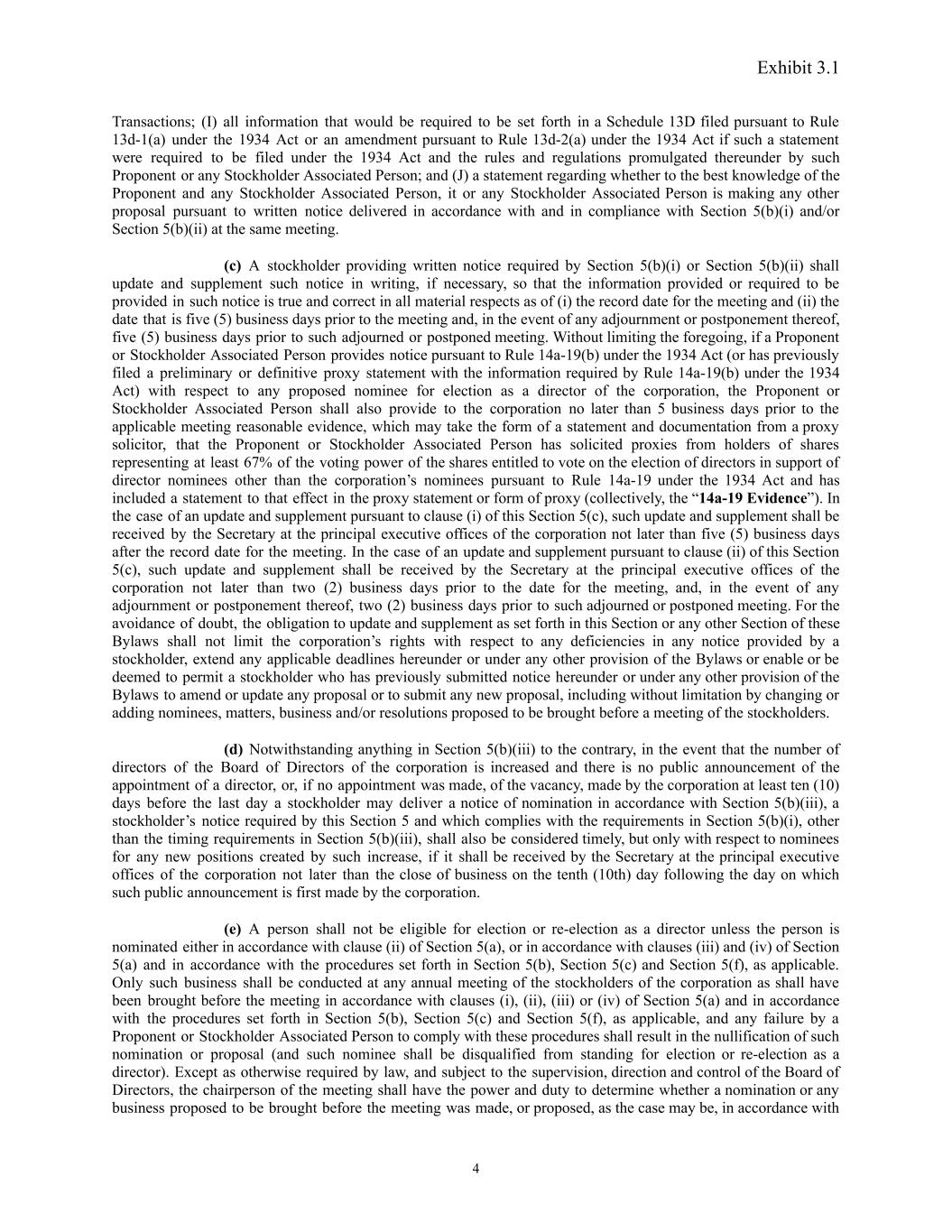 Exhibit 3.1 clause (iv) also subject to Section 5(f)) of these Bylaws, the stockholder must deliver written notice to the Secretary at the principal executive offices of the corporation on a timely basis as set forth in Section 5(b)(iii) and must update and supplement such written notice on a timely basis as set forth in Section 5(c). Such stockholder’s notice shall set forth: (A) as to each nominee such stockholder proposes to nominate at the meeting: (1) the name, age, business address and residence address of such nominee, (2) the principal occupation or employment of such nominee, (3) the class and number of shares of each class of capital stock of the corporation which are owned of record and beneficially by such nominee, (4) the date or dates on which such shares were acquired and the investment intent of such acquisition, (5) a statement whether such nominee, if elected, intends to tender, promptly following such person’s failure to receive the required vote for election or re-election at the next meeting at which such person would face election or re-election, an irrevocable resignation effective upon acceptance of such resignation by the Board of Directors, (6) such other information concerning such nominee as would be required to be disclosed in a proxy statement soliciting proxies for the election of such nominee as a director in an election contest (even if an election contest is not involved), or that is otherwise required to be disclosed pursuant to Section 14 of the 1934 Act (including such person’s written consent to being named as a nominee and to serving as a director if elected and a written statement of intent to serve as a director for the full term) and (7) a description of all direct and indirect compensation and other monetary agreements, arrangements and understandings during the past three years, and any other material relationships, between or among such proposed nominee, and his or her respective affiliates and associates, on the one hand, and such stockholder or any Stockholder Associated Person, on the other hand, including, without limitation, all information that would be required to be disclosed pursuant to Item 404 of Regulation S-K under the Exchange Act if the stockholder making the nomination or any Stockholder Associated Person were the “registrant” for purposes of such rule and the nominee were a director or executive officer of such registrant; (B) the information required by Section 5(b)(iv); and (C) if the stockholder or Stockholder Associated Person provides notice pursuant to Rule 14a-19(b) under the 1934 Act (or has previously filed a preliminary or definitive proxy statement with the information required by Rule 14a-19(b) under the 1934 Act) with respect to any proposed nominee for election as a director of the corporation, all other information required by Rule 14a-19 under the 1934 Act. Such stockholder’s notice shall also include the completed and signed written questionnaire, in the same form as the Corporation requests of the Board of Director's nominees for director, with respect to the background and qualification of each nominee (which questionnaire shall be in the form provided by the Secretary upon written request) and a written representation and agreement (which representation and agreement shall be in the form provided by the Secretary upon written request) from each nominee that such person (x) is not and will not become a party to (A) any agreement, arrangement or understanding with, and has not given any commitment or assurance to, any person or entity as to how such person, if elected as a director of the corporation, will act or vote on any issue or question (a “Voting Commitment”) except as has been disclosed to the corporation or (B) any Voting Commitment that could limit or interfere with such person’s ability to comply, if elected as a director of the corporation, with such person’s fiduciary duties under applicable law, and (y) is not and will not become a party to any agreement, arrangement or understanding with any person or entity other than the corporation with respect to any direct or indirect compensation, reimbursement or indemnification in connection with service or action as a nominee or director that has not been disclosed therein, would be in compliance, if elected as a director of the corporation, and will comply with all applicable publicly disclosed corporate governance, conflict of interest, confidentiality and stock ownership and trading policies and guidelines of the corporation. In addition, the corporation may require any proposed nominee to furnish such other information as it may reasonably require to determine the eligibility of such proposed nominee to serve as an independent director of the corporation. (ii) Other than proposals sought to be included in the corporation’s proxy materials pursuant to Rule 14a-8 under the 1934 Act, for business other than nominations for the election to the Board of Directors to be properly brought before an annual meeting by a stockholder pursuant to clauses (iii) and (iv) of Section 5(a) (with nominations under clause (iv) also subject to Section 5(f)) of these Bylaws, the stockholder must deliver written notice to the Secretary at the principal executive offices of the corporation on a timely basis as set forth in Section 5(b)(iii), and must update and supplement such written notice on a timely basis as set forth in Section 5(c). Such stockholder’s notice shall set forth: (A) as to each matter such stockholder proposes to bring before the meeting, a brief description of the business desired to be brought before the meeting, the text of the proposal or business (including the text of any resolutions proposed for consideration and in the event that such business includes a proposal to amend the Bylaws, the language of the proposed amendment), the reasons for conducting such business at the meeting, and any material interest (including any an