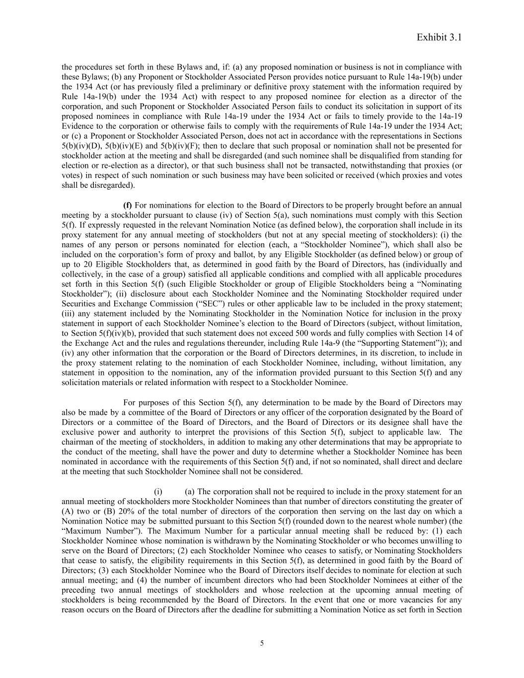Exhibit 3.1 the procedures set forth in these Bylaws and, if: (a) any proposed nomination or business is not in compliance with these Bylaws; (b) any Proponent or Stockholder Associated Person provides notice pursuant to Rule 14a-19(b) under the 1934 Act (or has previously filed a preliminary or definitive proxy statement with the information required by Rule 14a-19(b) under the 1934 Act) with respect to any proposed nominee for election as a director of the corporation, and such Proponent or Stockholder Associated Person fails to conduct its solicitation in support of its proposed nominees in compliance with Rule 14a-19 under the 1934 Act or fails to timely provide to the 14a-19 Evidence to the corporation or otherwise fails to comply with the requirements of Rule 14a-19 under the 1934 Act; or (c) a Proponent or Stockholder Associated Person, does not act in accordance with the representations in Sections 5(b)(iv)(D), 5(b)(iv)(E) and 5(b)(iv)(F); then to declare that such proposal or nomination shall not be presented for stockholder action at the meeting and shall be disregarded (and such nominee shall be disqualified from standing for election or re-election as a director), or that such business shall not be transacted, notwithstanding that proxies (or votes) in respect of such nomination or such business may have been solicited or received (which proxies and votes shall be disregarded). (f) For nominations for election to the Board of Directors to be properly brought before an annual meeting by a stockholder pursuant to clause (iv) of Section 5(a), such nominations must comply with this Section 5(f). If expressly requested in the relevant Nomination Notice (as defined below), the corporation shall include in its proxy statement for any annual meeting of stockholders (but not at any special meeting of stockholders): (i) the names of any person or persons nominated for election (each, a “Stockholder Nominee”), which shall also be included on the corporation’s form of proxy and ballot, by any Eligible Stockholder (as defined below) or group of up to 20 Eligible Stockholders that, as determined in good faith by the Board of Directors, has (individually and collectively, in the case of a group) satisfied all applicable conditions and complied with all applicable procedures set forth in this Section 5(f) (such Eligible Stockholder or group of Eligible Stockholders being a “Nominating Stockholder”); (ii) disclosure about each Stockholder Nominee and the Nominating Stockholder required under Securities and Exchange Commission (“SEC”) rules or other applicable law to be included in the proxy statement; (iii) any statement included by the Nominating Stockholder in the Nomination Notice for inclusion in the proxy statement in support of each Stockholder Nominee’s election to the Board of Directors (subject, without limitation, to Section 5(f)(iv)(b), provided that such statement does not exceed 500 words and fully complies with Section 14 of the Exchange Act and the rules and regulations thereunder, including Rule 14a-9 (the “Supporting Statement”)); and (iv) any other information that the corporation or the Board of Directors determines, in its discretion, to include in the proxy statement relating to the nomination of each Stockholder Nominee, including, without limitation, any statement in opposition to the nomination, any of the information provided pursuant to this Section 5(f) and any solicitation materials or related information with respect to a Stockholder Nominee. For purposes of this Section 5(f), any determination to be made by the Board of Directors may also be made by a committee of the Board of Directors or any officer of the corporation designated by the Board of Directors or a committee of the Board of Directors, and the Board of Directors or its designee shall have the exclusive power and authority to interpret the provisions of this Section 5(f), subject to applicable law. The chairman of the meeting of stockholders, in addition to making any other determinations that may be appropriate to the conduct of the meeting, shall have the power and duty to determine whether a Stockholder Nominee has been nominated in accordance with the requirements of this Section 5(f) and, if not so nominated, shall direct and declare at the meeting that such Stockholder Nominee shall not be considered. (i) (a) The corporation shall not be required to include in the proxy statement for an annual meeting of stockholders more Stockholder Nominees than that number of directors constituting the greater of (A) two or (B) 20% of the total number of directors of the corporation then serving on the last day on which a Nomination Notice may be submitted pursuant to this Section 5(f) (rounded down to the nearest whole number) (the “Maximum Number”). The Maximum Number for a particular annual meeting shall be reduced by: (1) each Stockholder Nominee whose nomination is withdrawn by the Nominating Stockholder or who becomes unwilling to serve on the Board of Directors; (2) each Stockholder Nominee who ceases to satisfy, or Nominating Stockholders that cease to satisfy, the eligibility requirements in this Section 5(f), as determined in good faith by the Board of Directors; (3) each Stockholder Nominee who the Board of Directors itself decides to nominate for election at such annual meeting; and (4) the number of incumbent directors who had been Stockholder Nominees at either of the preceding two annual meetings of stockholders and whose reelection at the upcoming annual meeting of stockholders is being recommended by the Board of Directors. In the event that one or more vacancies for any reason occurs on the Board of Directors after the deadline for submitting a Nomination Notice as set forth in Section 5