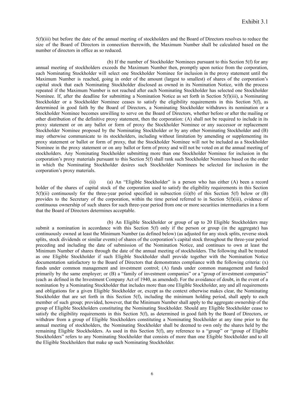 Exhibit 3.1 5(f)(iii) but before the date of the annual meeting of stockholders and the Board of Directors resolves to reduce the size of the Board of Directors in connection therewith, the Maximum Number shall be calculated based on the number of directors in office as so reduced. (b) If the number of Stockholder Nominees pursuant to this Section 5(f) for any annual meeting of stockholders exceeds the Maximum Number then, promptly upon notice from the corporation, each Nominating Stockholder will select one Stockholder Nominee for inclusion in the proxy statement until the Maximum Number is reached, going in order of the amount (largest to smallest) of shares of the corporation’s capital stock that each Nominating Stockholder disclosed as owned in its Nomination Notice, with the process repeated if the Maximum Number is not reached after each Nominating Stockholder has selected one Stockholder Nominee. If, after the deadline for submitting a Nomination Notice as set forth in Section 5(f)(iii), a Nominating Stockholder or a Stockholder Nominee ceases to satisfy the eligibility requirements in this Section 5(f), as determined in good faith by the Board of Directors, a Nominating Stockholder withdraws its nomination or a Stockholder Nominee becomes unwilling to serve on the Board of Directors, whether before or after the mailing or other distribution of the definitive proxy statement, then the corporation: (A) shall not be required to include in its proxy statement or on any ballot or form of proxy the Stockholder Nominee or any successor or replacement Stockholder Nominee proposed by the Nominating Stockholder or by any other Nominating Stockholder and (B) may otherwise communicate to its stockholders, including without limitation by amending or supplementing its proxy statement or ballot or form of proxy, that the Stockholder Nominee will not be included as a Stockholder Nominee in the proxy statement or on any ballot or form of proxy and will not be voted on at the annual meeting of stockholders. Any Nominating Stockholder submitting more than one Stockholder Nominee for inclusion in the corporation’s proxy materials pursuant to this Section 5(f) shall rank such Stockholder Nominees based on the order in which the Nominating Stockholder desires such Stockholder Nominees be selected for inclusion in the corporation’s proxy materials. (ii) (a) An “Eligible Stockholder” is a person who has either (A) been a record holder of the shares of capital stock of the corporation used to satisfy the eligibility requirements in this Section 5(f)(ii) continuously for the three-year period specified in subsection (ii)(b) of this Section 5(f) below or (B) provides to the Secretary of the corporation, within the time period referred to in Section 5(f)(iii), evidence of continuous ownership of such shares for such three-year period from one or more securities intermediaries in a form that the Board of Directors determines acceptable. (b) An Eligible Stockholder or group of up to 20 Eligible Stockholders may submit a nomination in accordance with this Section 5(f) only if the person or group (in the aggregate) has continuously owned at least the Minimum Number (as defined below) (as adjusted for any stock splits, reverse stock splits, stock dividends or similar events) of shares of the corporation’s capital stock throughout the three-year period preceding and including the date of submission of the Nomination Notice, and continues to own at least the Minimum Number of shares through the date of the annual meeting of stockholders. The following shall be treated as one Eligible Stockholder if such Eligible Stockholder shall provide together with the Nomination Notice documentation satisfactory to the Board of Directors that demonstrates compliance with the following criteria: (x) funds under common management and investment control; (A) funds under common management and funded primarily by the same employer; or (B) a “family of investment companies” or a “group of investment companies” (each as defined in the Investment Company Act of 1940, as amended). For the avoidance of doubt, in the event of a nomination by a Nominating Stockholder that includes more than one Eligible Stockholder, any and all requirements and obligations for a given Eligible Stockholder or, except as the context otherwise makes clear, the Nominating Stockholder that are set forth in this Section 5(f), including the minimum holding period, shall apply to each member of such group; provided, however, that the Minimum Number shall apply to the aggregate ownership of the group of Eligible Stockholders constituting the Nominating Stockholder. Should any Eligible Stockholder cease to satisfy the eligibility requirements in this Section 5(f), as determined in good faith by the Board of Directors, or withdraw from a group of Eligible Stockholders constituting a Nominating Stockholder at any time prior to the annual meeting of stockholders, the Nominating Stockholder shall be deemed to own only the shares held by the remaining Eligible Stockholders. As used in this Section 5(f), any reference to a “group” or “group of Eligible Stockholders” refers to any Nominating Stockholder that consists of more than one Eligible Stockholder and to all the Eligible Stockholders that make up such Nominating Stockholder. 6
