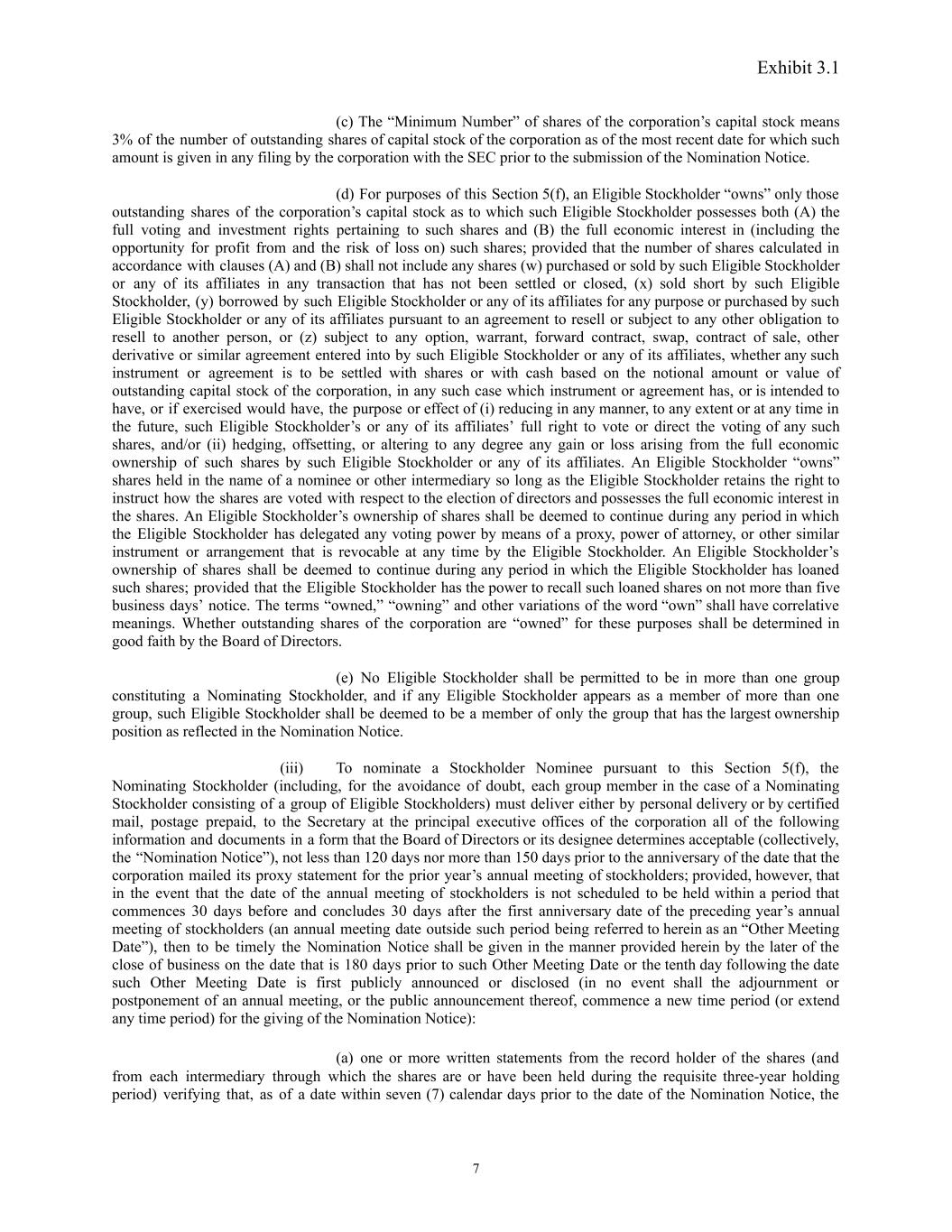 Exhibit 3.1 (c) The “Minimum Number” of shares of the corporation’s capital stock means 3% of the number of outstanding shares of capital stock of the corporation as of the most recent date for which such amount is given in any filing by the corporation with the SEC prior to the submission of the Nomination Notice. (d) For purposes of this Section 5(f), an Eligible Stockholder “owns” only those outstanding shares of the corporation’s capital stock as to which such Eligible Stockholder possesses both (A) the full voting and investment rights pertaining to such shares and (B) the full economic interest in (including the opportunity for profit from and the risk of loss on) such shares; provided that the number of shares calculated in accordance with clauses (A) and (B) shall not include any shares (w) purchased or sold by such Eligible Stockholder or any of its affiliates in any transaction that has not been settled or closed, (x) sold short by such Eligible Stockholder, (y) borrowed by such Eligible Stockholder or any of its affiliates for any purpose or purchased by such Eligible Stockholder or any of its affiliates pursuant to an agreement to resell or subject to any other obligation to resell to another person, or (z) subject to any option, warrant, forward contract, swap, contract of sale, other derivative or similar agreement entered into by such Eligible Stockholder or any of its affiliates, whether any such instrument or agreement is to be settled with shares or with cash based on the notional amount or value of outstanding capital stock of the corporation, in any such case which instrument or agreement has, or is intended to have, or if exercised would have, the purpose or effect of (i) reducing in any manner, to any extent or at any time in the future, such Eligible Stockholder’s or any of its affiliates’ full right to vote or direct the voting of any such shares, and/or (ii) hedging, offsetting, or altering to any degree any gain or loss arising from the full economic ownership of such shares by such Eligible Stockholder or any of its affiliates. An Eligible Stockholder “owns” shares held in the name of a nominee or other intermediary so long as the Eligible Stockholder retains the right to instruct how the shares are voted with respect to the election of directors and possesses the full economic interest in the shares. An Eligible Stockholder’s ownership of shares shall be deemed to continue during any period in which the Eligible Stockholder has delegated any voting power by means of a proxy, power of attorney, or other similar instrument or arrangement that is revocable at any time by the Eligible Stockholder. An Eligible Stockholder’s ownership of shares shall be deemed to continue during any period in which the Eligible Stockholder has loaned such shares; provided that the Eligible Stockholder has the power to recall such loaned shares on not more than five business days’ notice. The terms “owned,” “owning” and other variations of the word “own” shall have correlative meanings. Whether outstanding shares of the corporation are “owned” for these purposes shall be determined in good faith by the Board of Directors. (e) No Eligible Stockholder shall be permitted to be in more than one group constituting a Nominating Stockholder, and if any Eligible Stockholder appears as a member of more than one group, such Eligible Stockholder shall be deemed to be a member of only the group that has the largest ownership position as reflected in the Nomination Notice. (iii) To nominate a Stockholder Nominee pursuant to this Section 5(f), the Nominating Stockholder (including, for the avoidance of doubt, each group member in the case of a Nominating Stockholder consisting of a group of Eligible Stockholders) must deliver either by personal delivery or by certified mail, postage prepaid, to the Secretary at the principal executive offices of the corporation all of the following information and documents in a form that the Board of Directors or its designee determines acceptable (collectively, the “Nomination Notice”), not less than 120 days nor more than 150 days prior to the anniversary of the date that the corporation mailed its proxy statement for the prior year’s annual meeting of stockholders; provided, however, that in the event that the date of the annual meeting of stockholders is not scheduled to be held within a period that commences 30 days before and concludes 30 days after the first anniversary date of the preceding year’s annual meeting of stockholders (an annual meeting date outside such period being referred to herein as an “Other Meeting Date”), then to be timely the Nomination Notice shall be given in the manner provided herein by the later of the close of business on the date that is 180 days prior to such Other Meeting Date or the tenth day following the date such Other Meeting Date is first publicly announced or disclosed (in no event shall the adjournment or postponement of an annual meeting, or the public announcement thereof, commence a new time period (or extend any time period) for the giving of the Nomination Notice): (a) one or more written statements from the record holder of the shares (and from each intermediary through which the shares are or have been held during the requisite three-year holding period) verifying that, as of a date within seven (7) calendar days prior to the date of the Nomination Notice, the 7