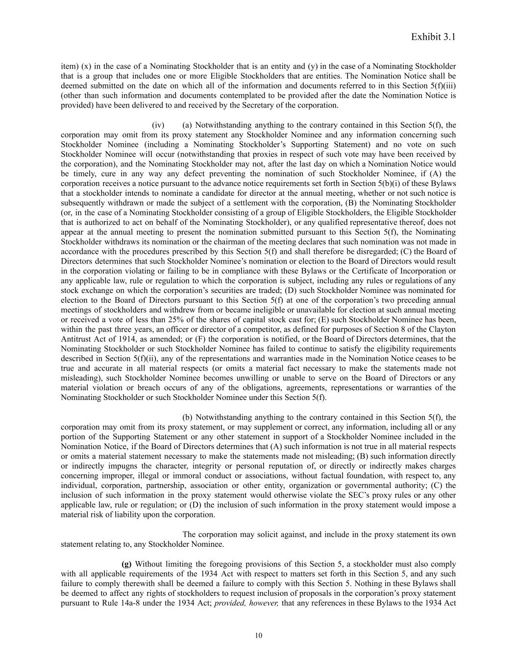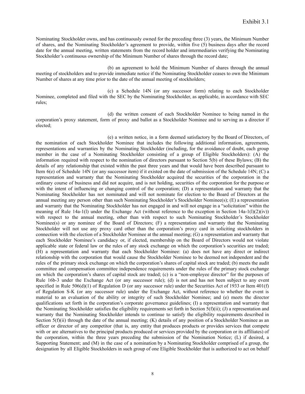Exhibit 3.1 item) (x) in the case of a Nominating Stockholder that is an entity and (y) in the case of a Nominating Stockholder that is a group that includes one or more Eligible Stockholders that are entities. The Nomination Notice shall be deemed submitted on the date on which all of the information and documents referred to in this Section 5(f)(iii) (other than such information and documents contemplated to be provided after the date the Nomination Notice is provided) have been delivered to and received by the Secretary of the corporation. (iv) (a) Notwithstanding anything to the contrary contained in this Section 5(f), the corporation may omit from its proxy statement any Stockholder Nominee and any information concerning such Stockholder Nominee (including a Nominating Stockholder’s Supporting Statement) and no vote on such Stockholder Nominee will occur (notwithstanding that proxies in respect of such vote may have been received by the corporation), and the Nominating Stockholder may not, after the last day on which a Nomination Notice would be timely, cure in any way any defect preventing the nomination of such Stockholder Nominee, if (A) the corporation receives a notice pursuant to the advance notice requirements set forth in Section 5(b)(i) of these Bylaws that a stockholder intends to nominate a candidate for director at the annual meeting, whether or not such notice is subsequently withdrawn or made the subject of a settlement with the corporation, (B) the Nominating Stockholder (or, in the case of a Nominating Stockholder consisting of a group of Eligible Stockholders, the Eligible Stockholder that is authorized to act on behalf of the Nominating Stockholder), or any qualified representative thereof, does not appear at the annual meeting to present the nomination submitted pursuant to this Section 5(f), the Nominating Stockholder withdraws its nomination or the chairman of the meeting declares that such nomination was not made in accordance with the procedures prescribed by this Section 5(f) and shall therefore be disregarded; (C) the Board of Directors determines that such Stockholder Nominee’s nomination or election to the Board of Directors would result in the corporation violating or failing to be in compliance with these Bylaws or the Certificate of Incorporation or any applicable law, rule or regulation to which the corporation is subject, including any rules or regulations of any stock exchange on which the corporation’s securities are traded; (D) such Stockholder Nominee was nominated for election to the Board of Directors pursuant to this Section 5(f) at one of the corporation’s two preceding annual meetings of stockholders and withdrew from or became ineligible or unavailable for election at such annual meeting or received a vote of less than 25% of the shares of capital stock cast for; (E) such Stockholder Nominee has been, within the past three years, an officer or director of a competitor, as defined for purposes of Section 8 of the Clayton Antitrust Act of 1914, as amended; or (F) the corporation is notified, or the Board of Directors determines, that the Nominating Stockholder or such Stockholder Nominee has failed to continue to satisfy the eligibility requirements described in Section 5(f)(ii), any of the representations and warranties made in the Nomination Notice ceases to be true and accurate in all material respects (or omits a material fact necessary to make the statements made not misleading), such Stockholder Nominee becomes unwilling or unable to serve on the Board of Directors or any material violation or breach occurs of any of the obligations, agreements, representations or warranties of the Nominating Stockholder or such Stockholder Nominee under this Section 5(f). (b) Notwithstanding anything to the contrary contained in this Section 5(f), the corporation may omit from its proxy statement, or may supplement or correct, any information, including all or any portion of the Supporting Statement or any other statement in support of a Stockholder Nominee included in the Nomination Notice, if the Board of Directors determines that (A) such information is not true in all material respects or omits a material statement necessary to make the statements made not misleading; (B) such information directly or indirectly impugns the character, integrity or personal reputation of, or directly or indirectly makes charges concerning improper, illegal or immoral conduct or associations, without factual foundation, with respect to, any individual, corporation, partnership, association or other entity, organization or governmental authority; (C) the inclusion of such information in the proxy statement would otherwise violate the SEC’s proxy rules or any other applicable law, rule or regulation; or (D) the inclusion of such information in the proxy statement would impose a material risk of liability upon the corporation. The corporation may solicit against, and include in the proxy statement its own statement relating to, any Stockholder Nominee. (g) Without limiting the foregoing provisions of this Section 5, a stockholder must also comply with all applicable requirements of the 1934 Act with respect to matters set forth in this Section 5, and any such failure to comply therewith shall be deemed a failure to comply with this Section 5. Nothing in these Bylaws shall be deemed to affect any rights of stockholders to request inclusion of proposals in the corporation’s proxy statement pursuant to Rule 14a-8 under the 1934 Act; provided, however, that any references in these Bylaws to the 1934 Act 10