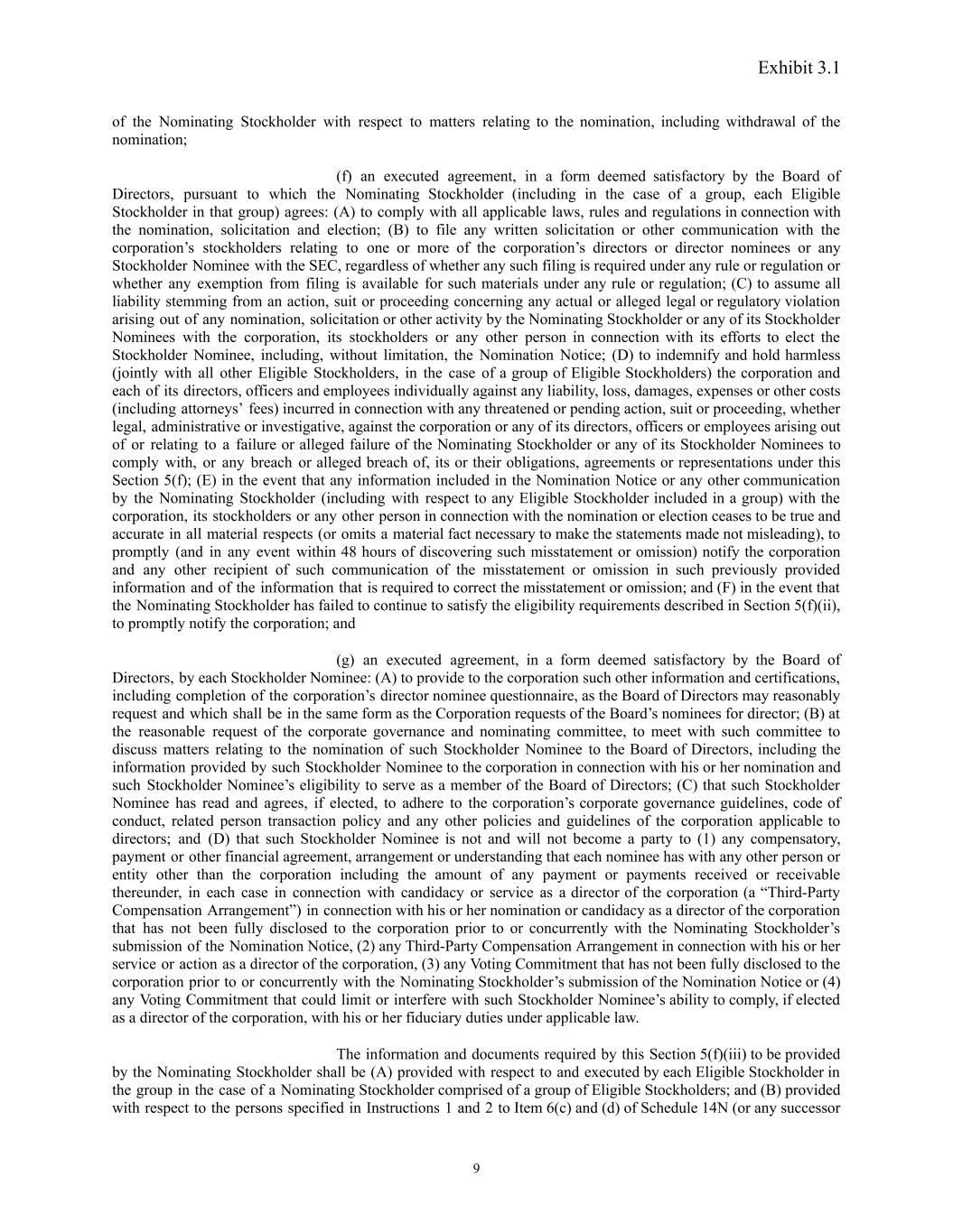 Exhibit 3.1 of the Nominating Stockholder with respect to matters relating to the nomination, including withdrawal of the nomination; (f) an executed agreement, in a form deemed satisfactory by the Board of Directors, pursuant to which the Nominating Stockholder (including in the case of a group, each Eligible Stockholder in that group) agrees: (A) to comply with all applicable laws, rules and regulations in connection with the nomination, solicitation and election; (B) to file any written solicitation or other communication with the corporation’s stockholders relating to one or more of the corporation’s directors or director nominees or any Stockholder Nominee with the SEC, regardless of whether any such filing is required under any rule or regulation or whether any exemption from filing is available for such materials under any rule or regulation; (C) to assume all liability stemming from an action, suit or proceeding concerning any actual or alleged legal or regulatory violation arising out of any nomination, solicitation or other activity by the Nominating Stockholder or any of its Stockholder Nominees with the corporation, its stockholders or any other person in connection with its efforts to elect the Stockholder Nominee, including, without limitation, the Nomination Notice; (D) to indemnify and hold harmless (jointly with all other Eligible Stockholders, in the case of a group of Eligible Stockholders) the corporation and each of its directors, officers and employees individually against any liability, loss, damages, expenses or other costs (including attorneys’ fees) incurred in connection with any threatened or pending action, suit or proceeding, whether legal, administrative or investigative, against the corporation or any of its directors, officers or employees arising out of or relating to a failure or alleged failure of the Nominating Stockholder or any of its Stockholder Nominees to comply with, or any breach or alleged breach of, its or their obligations, agreements or representations under this Section 5(f); (E) in the event that any information included in the Nomination Notice or any other communication by the Nominating Stockholder (including with respect to any Eligible Stockholder included in a group) with the corporation, its stockholders or any other person in connection with the nomination or election ceases to be true and accurate in all material respects (or omits a material fact necessary to make the statements made not misleading), to promptly (and in any event within 48 hours of discovering such misstatement or omission) notify the corporation and any other recipient of such communication of the misstatement or omission in such previously provided information and of the information that is required to correct the misstatement or omission; and (F) in the event that the Nominating Stockholder has failed to continue to satisfy the eligibility requirements described in Section 5(f)(ii), to promptly notify the corporation; and (g) an executed agreement, in a form deemed satisfactory by the Board of Directors, by each Stockholder Nominee: (A) to provide to the corporation such other information and certifications, including completion of the corporation’s director nominee questionnaire, as the Board of Directors may reasonably request and which shall be in the same form as the Corporation requests of the Board’s nominees for director; (B) at the reasonable request of the corporate governance and nominating committee, to meet with such committee to discuss matters relating to the nomination of such Stockholder Nominee to the Board of Directors, including the information provided by such Stockholder Nominee to the corporation in connection with his or her nomination and such Stockholder Nominee’s eligibility to serve as a member of the Board of Directors; (C) that such Stockholder Nominee has read and agrees, if elected, to adhere to the corporation’s corporate governance guidelines, code of conduct, related person transaction policy and any other policies and guidelines of the corporation applicable to directors; and (D) that such Stockholder Nominee is not and will not become a party to (1) any compensatory, payment or other financial agreement, arrangement or understanding that each nominee has with any other person or entity other than the corporation including the amount of any payment or payments received or receivable thereunder, in each case in connection with candidacy or service as a director of the corporation (a “Third-Party Compensation Arrangement”) in connection with his or her nomination or candidacy as a director of the corporation that has not been fully disclosed to the corporation prior to or concurrently with the Nominating Stockholder’s submission of the Nomination Notice, (2) any Third-Party Compensation Arrangement in connection with his or her service or action as a director of the corporation, (3) any Voting Commitment that has not been fully disclosed to the corporation prior to or concurrently with the Nominating Stockholder’s submission of the Nomination Notice or (4) any Voting Commitment that could limit or interfere with such Stockholder Nominee’s ability to comply, if elected as a director of the corporation, with his or her fiduciary duties under applicable law. The information and documents required by this Section 5(f)(iii) to be provided by the Nominating Stockholder shall be (A) provided with respect to and executed by each Eligible Stockholder in the group in the case of a Nominating Stockholder comprised of a group of Eligible Stockholders; and (B) provided with respect to the persons specified in Instructions 1 and 2 to Item 6(c) and (d) of Schedule 14N (or any successor 9