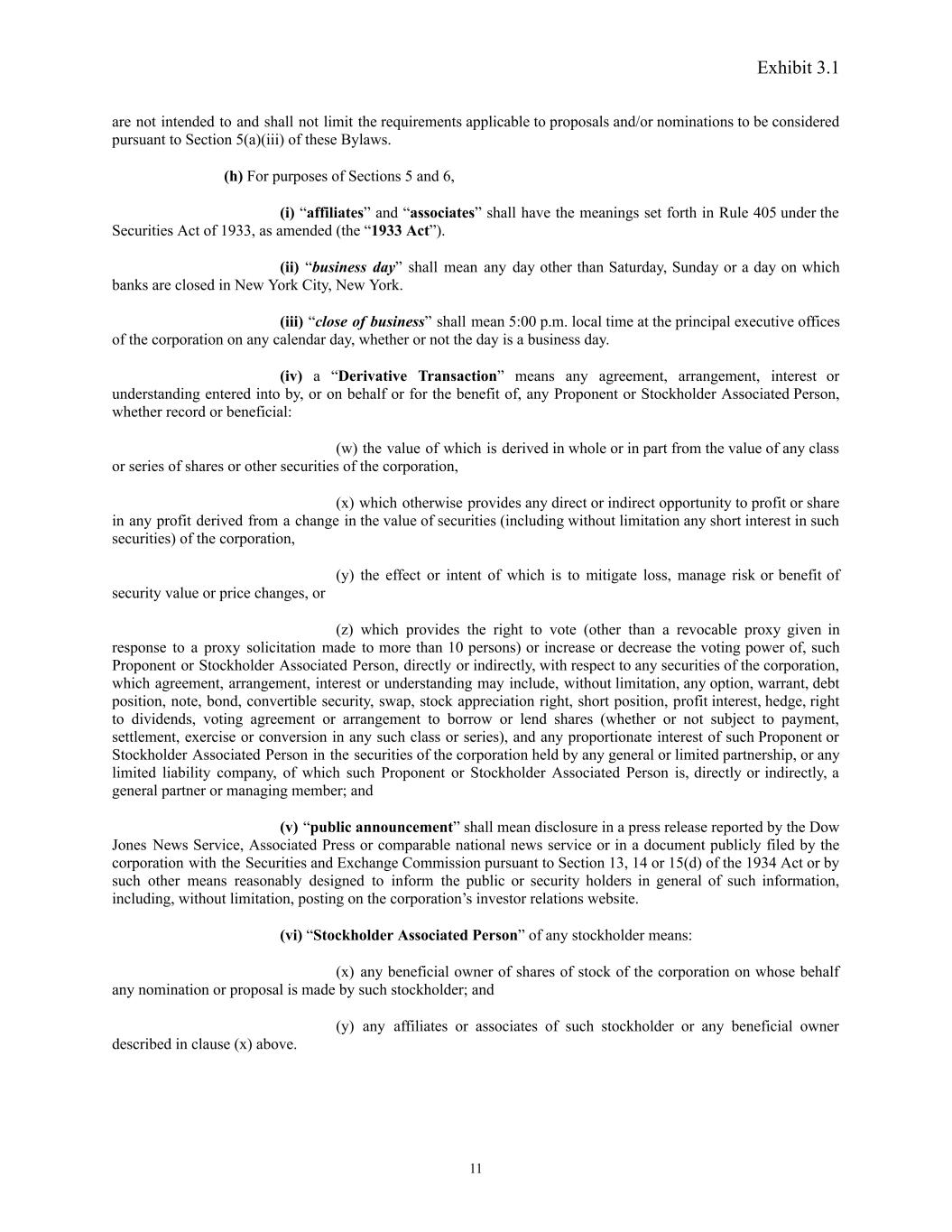 Exhibit 3.1 are not intended to and shall not limit the requirements applicable to proposals and/or nominations to be considered pursuant to Section 5(a)(iii) of these Bylaws. (h) For purposes of Sections 5 and 6, (i) “affiliates” and “associates” shall have the meanings set forth in Rule 405 under the Securities Act of 1933, as amended (the “1933 Act”). (ii) “business day” shall mean any day other than Saturday, Sunday or a day on which banks are closed in New York City, New York. (iii) “close of business” shall mean 5:00 p.m. local time at the principal executive offices of the corporation on any calendar day, whether or not the day is a business day. (iv) a “Derivative Transaction” means any agreement, arrangement, interest or understanding entered into by, or on behalf or for the benefit of, any Proponent or Stockholder Associated Person, whether record or beneficial: (w) the value of which is derived in whole or in part from the value of any class or series of shares or other securities of the corporation, (x) which otherwise provides any direct or indirect opportunity to profit or share in any profit derived from a change in the value of securities (including without limitation any short interest in such securities) of the corporation, (y) the effect or intent of which is to mitigate loss, manage risk or benefit of security value or price changes, or (z) which provides the right to vote (other than a revocable proxy given in response to a proxy solicitation made to more than 10 persons) or increase or decrease the voting power of, such Proponent or Stockholder Associated Person, directly or indirectly, with respect to any securities of the corporation, which agreement, arrangement, interest or understanding may include, without limitation, any option, warrant, debt position, note, bond, convertible security, swap, stock appreciation right, short position, profit interest, hedge, right to dividends, voting agreement or arrangement to borrow or lend shares (whether or not subject to payment, settlement, exercise or conversion in any such class or series), and any proportionate interest of such Proponent or Stockholder Associated Person in the securities of the corporation held by any general or limited partnership, or any limited liability company, of which such Proponent or Stockholder Associated Person is, directly or indirectly, a general partner or managing member; and (v) “public announcement” shall mean disclosure in a press release reported by the Dow Jones News Service, Associated Press or comparable national news service or in a document publicly filed by the corporation with the Securities and Exchange Commission pursuant to Section 13, 14 or 15(d) of the 1934 Act or by such other means reasonably designed to inform the public or security holders in general of such information, including, without limitation, posting on the corporation’s investor relations website. (vi) “Stockholder Associated Person” of any stockholder means: (x) any beneficial owner of shares of stock of the corporation on whose behalf any nomination or proposal is made by such stockholder; and (y) any affiliates or associates of such stockholder or any beneficial owner described in clause (x) above. 11