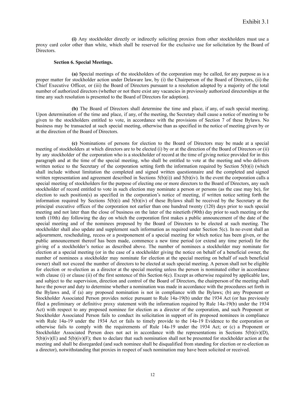 Exhibit 3.1 (i) Any stockholder directly or indirectly soliciting proxies from other stockholders must use a proxy card color other than white, which shall be reserved for the exclusive use for solicitation by the Board of Directors. Section 6. Special Meetings. (a) Special meetings of the stockholders of the corporation may be called, for any purpose as is a proper matter for stockholder action under Delaware law, by (i) the Chairperson of the Board of Directors, (ii) the Chief Executive Officer, or (iii) the Board of Directors pursuant to a resolution adopted by a majority of the total number of authorized directors (whether or not there exist any vacancies in previously authorized directorships at the time any such resolution is presented to the Board of Directors for adoption). (b) The Board of Directors shall determine the time and place, if any, of such special meeting. Upon determination of the time and place, if any, of the meeting, the Secretary shall cause a notice of meeting to be given to the stockholders entitled to vote, in accordance with the provisions of Section 7 of these Bylaws. No business may be transacted at such special meeting, otherwise than as specified in the notice of meeting given by or at the direction of the Board of Directors. (c) Nominations of persons for election to the Board of Directors may be made at a special meeting of stockholders at which directors are to be elected (i) by or at the direction of the Board of Directors or (ii) by any stockholder of the corporation who is a stockholder of record at the time of giving notice provided for in this paragraph and at the time of the special meeting, who shall be entitled to vote at the meeting and who delivers written notice to the Secretary of the corporation setting forth the information required by Section 5(b)(i) (which shall include without limitation the completed and signed written questionnaire and the completed and signed written representation and agreement described in Sections 5(b)(i)) and 5(b)(iv). In the event the corporation calls a special meeting of stockholders for the purpose of electing one or more directors to the Board of Directors, any such stockholder of record entitled to vote in such election may nominate a person or persons (as the case may be), for election to such position(s) as specified in the corporation’s notice of meeting, if written notice setting forth the information required by Sections 5(b)(i) and 5(b)(iv) of these Bylaws shall be received by the Secretary at the principal executive offices of the corporation not earlier than one hundred twenty (120) days prior to such special meeting and not later than the close of business on the later of the ninetieth (90th) day prior to such meeting or the tenth (10th) day following the day on which the corporation first makes a public announcement of the date of the special meeting and of the nominees proposed by the Board of Directors to be elected at such meeting. The stockholder shall also update and supplement such information as required under Section 5(c). In no event shall an adjournment, rescheduling, recess or a postponement of a special meeting for which notice has been given, or the public announcement thereof has been made, commence a new time period (or extend any time period) for the giving of a stockholder’s notice as described above. The number of nominees a stockholder may nominate for election at a special meeting (or in the case of a stockholder giving the notice on behalf of a beneficial owner, the number of nominees a stockholder may nominate for election at the special meeting on behalf of such beneficial owner) shall not exceed the number of directors to be elected at such special meeting. A person shall not be eligible for election or re-election as a director at the special meeting unless the person is nominated either in accordance with clause (i) or clause (ii) of the first sentence of this Section 6(c). Except as otherwise required by applicable law, and subject to the supervision, direction and control of the Board of Directors, the chairperson of the meeting shall have the power and duty to determine whether a nomination was made in accordance with the procedures set forth in the Bylaws and, if (a) any proposed nomination is not in compliance with the Bylaws; (b) any Proponent or Stockholder Associated Person provides notice pursuant to Rule 14a-19(b) under the 1934 Act (or has previously filed a preliminary or definitive proxy statement with the information required by Rule 14a-19(b) under the 1934 Act) with respect to any proposed nominee for election as a director of the corporation, and such Proponent or Stockholder Associated Person fails to conduct its solicitation in support of its proposed nominees in compliance with Rule 14a-19 under the 1934 Act or fails to timely provide to the 14a-19 Evidence to the corporation or otherwise fails to comply with the requirements of Rule 14a-19 under the 1934 Act; or (c) a Proponent or Stockholder Associated Person does not act in accordance with the representations in Sections 5(b)(iv)(D), 5(b)(iv)(E) and 5(b)(iv)(F); then to declare that such nomination shall not be presented for stockholder action at the meeting and shall be disregarded (and such nominee shall be disqualified from standing for election or re-election as a director), notwithstanding that proxies in respect of such nomination may have been solicited or received. 12