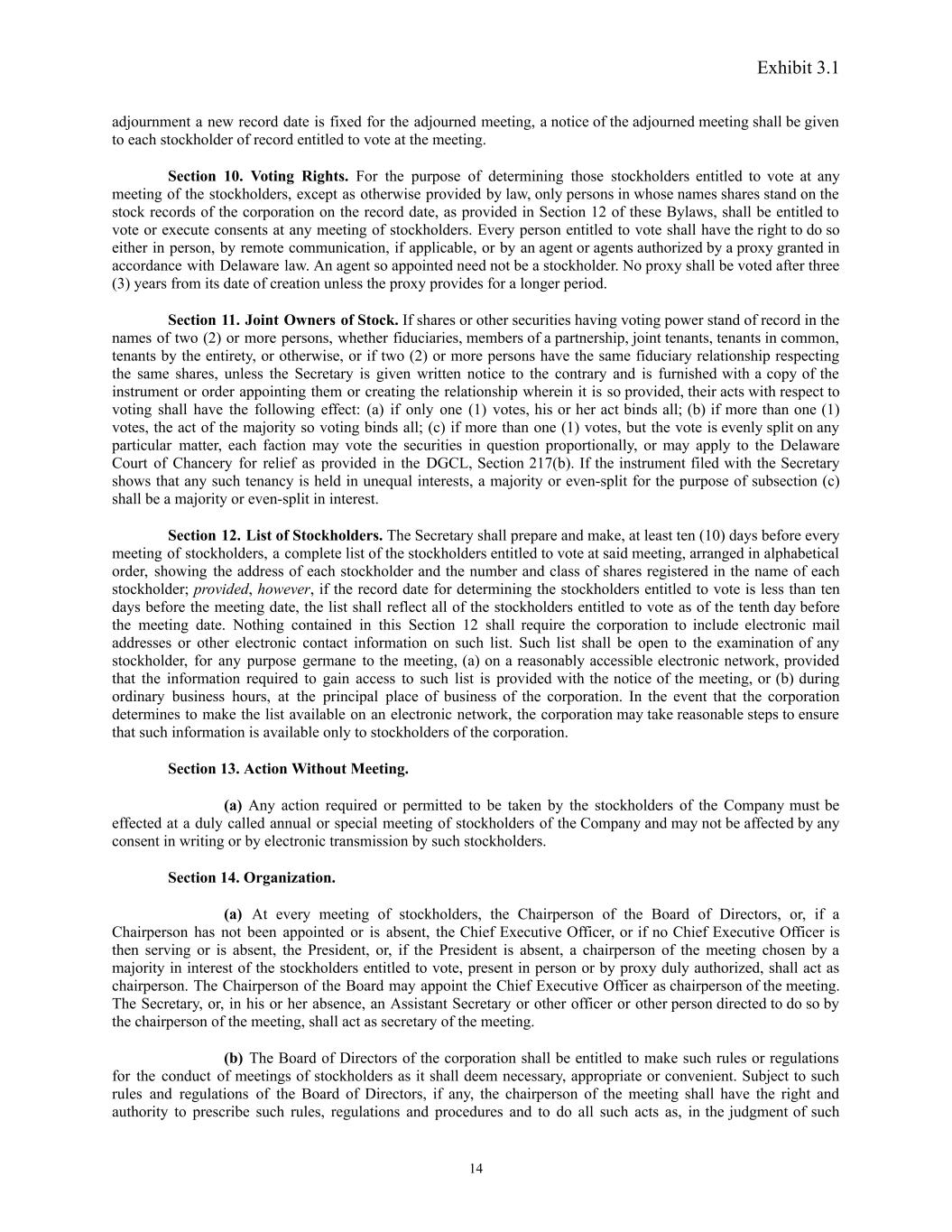 Exhibit 3.1 adjournment a new record date is fixed for the adjourned meeting, a notice of the adjourned meeting shall be given to each stockholder of record entitled to vote at the meeting. Section 10. Voting Rights. For the purpose of determining those stockholders entitled to vote at any meeting of the stockholders, except as otherwise provided by law, only persons in whose names shares stand on the stock records of the corporation on the record date, as provided in Section 12 of these Bylaws, shall be entitled to vote or execute consents at any meeting of stockholders. Every person entitled to vote shall have the right to do so either in person, by remote communication, if applicable, or by an agent or agents authorized by a proxy granted in accordance with Delaware law. An agent so appointed need not be a stockholder. No proxy shall be voted after three (3) years from its date of creation unless the proxy provides for a longer period. Section 11. Joint Owners of Stock. If shares or other securities having voting power stand of record in the names of two (2) or more persons, whether fiduciaries, members of a partnership, joint tenants, tenants in common, tenants by the entirety, or otherwise, or if two (2) or more persons have the same fiduciary relationship respecting the same shares, unless the Secretary is given written notice to the contrary and is furnished with a copy of the instrument or order appointing them or creating the relationship wherein it is so provided, their acts with respect to voting shall have the following effect: (a) if only one (1) votes, his or her act binds all; (b) if more than one (1) votes, the act of the majority so voting binds all; (c) if more than one (1) votes, but the vote is evenly split on any particular matter, each faction may vote the securities in question proportionally, or may apply to the Delaware Court of Chancery for relief as provided in the DGCL, Section 217(b). If the instrument filed with the Secretary shows that any such tenancy is held in unequal interests, a majority or even-split for the purpose of subsection (c) shall be a majority or even-split in interest. Section 12. List of Stockholders. The Secretary shall prepare and make, at least ten (10) days before every meeting of stockholders, a complete list of the stockholders entitled to vote at said meeting, arranged in alphabetical order, showing the address of each stockholder and the number and class of shares registered in the name of each stockholder; provided, however, if the record date for determining the stockholders entitled to vote is less than ten days before the meeting date, the list shall reflect all of the stockholders entitled to vote as of the tenth day before the meeting date. Nothing contained in this Section 12 shall require the corporation to include electronic mail addresses or other electronic contact information on such list. Such list shall be open to the examination of any stockholder, for any purpose germane to the meeting, (a) on a reasonably accessible electronic network, provided that the information required to gain access to such list is provided with the notice of the meeting, or (b) during ordinary business hours, at the principal place of business of the corporation. In the event that the corporation determines to make the list available on an electronic network, the corporation may take reasonable steps to ensure that such information is available only to stockholders of the corporation. Section 13. Action Without Meeting. (a) Any action required or permitted to be taken by the stockholders of the Company must be effected at a duly called annual or special meeting of stockholders of the Company and may not be affected by any consent in writing or by electronic transmission by such stockholders. Section 14. Organization. (a) At every meeting of stockholders, the Chairperson of the Board of Directors, or, if a Chairperson has not been appointed or is absent, the Chief Executive Officer, or if no Chief Executive Officer is then serving or is absent, the President, or, if the President is absent, a chairperson of the meeting chosen by a majority in interest of the stockholders entitled to vote, present in person or by proxy duly authorized, shall act as chairperson. The Chairperson of the Board may appoint the Chief Executive Officer as chairperson of the meeting. The Secretary, or, in his or her absence, an Assistant Secretary or other officer or other person directed to do so by the chairperson of the meeting, shall act as secretary of the meeting. (b) The Board of Directors of the corporation shall be entitled to make such rules or regulations for the conduct of meetings of stockholders as it shall deem necessary, appropriate or convenient. Subject to such rules and regulations of the Board of Directors, if any, the chairperson of the meeting shall have the right and authority to prescribe such rules, regulations and procedures and to do all such acts as, in the judgment of such 14
