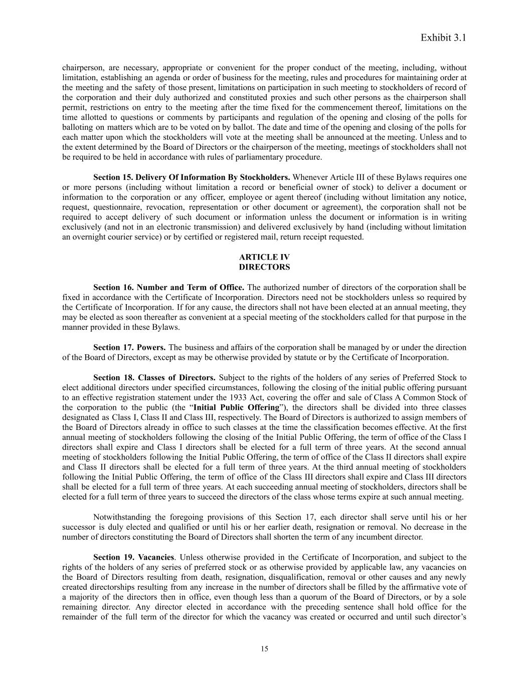 Exhibit 3.1 chairperson, are necessary, appropriate or convenient for the proper conduct of the meeting, including, without limitation, establishing an agenda or order of business for the meeting, rules and procedures for maintaining order at the meeting and the safety of those present, limitations on participation in such meeting to stockholders of record of the corporation and their duly authorized and constituted proxies and such other persons as the chairperson shall permit, restrictions on entry to the meeting after the time fixed for the commencement thereof, limitations on the time allotted to questions or comments by participants and regulation of the opening and closing of the polls for balloting on matters which are to be voted on by ballot. The date and time of the opening and closing of the polls for each matter upon which the stockholders will vote at the meeting shall be announced at the meeting. Unless and to the extent determined by the Board of Directors or the chairperson of the meeting, meetings of stockholders shall not be required to be held in accordance with rules of parliamentary procedure. Section 15. Delivery Of Information By Stockholders. Whenever Article III of these Bylaws requires one or more persons (including without limitation a record or beneficial owner of stock) to deliver a document or information to the corporation or any officer, employee or agent thereof (including without limitation any notice, request, questionnaire, revocation, representation or other document or agreement), the corporation shall not be required to accept delivery of such document or information unless the document or information is in writing exclusively (and not in an electronic transmission) and delivered exclusively by hand (including without limitation an overnight courier service) or by certified or registered mail, return receipt requested. ARTICLE IV DIRECTORS Section 16. Number and Term of Office. The authorized number of directors of the corporation shall be fixed in accordance with the Certificate of Incorporation. Directors need not be stockholders unless so required by the Certificate of Incorporation. If for any cause, the directors shall not have been elected at an annual meeting, they may be elected as soon thereafter as convenient at a special meeting of the stockholders called for that purpose in the manner provided in these Bylaws. Section 17. Powers. The business and affairs of the corporation shall be managed by or under the direction of the Board of Directors, except as may be otherwise provided by statute or by the Certificate of Incorporation. Section 18. Classes of Directors. Subject to the rights of the holders of any series of Preferred Stock to elect additional directors under specified circumstances, following the closing of the initial public offering pursuant to an effective registration statement under the 1933 Act, covering the offer and sale of Class A Common Stock of the corporation to the public (the “Initial Public Offering”), the directors shall be divided into three classes designated as Class I, Class II and Class III, respectively. The Board of Directors is authorized to assign members of the Board of Directors already in office to such classes at the time the classification becomes effective. At the first annual meeting of stockholders following the closing of the Initial Public Offering, the term of office of the Class I directors shall expire and Class I directors shall be elected for a full term of three years. At the second annual meeting of stockholders following the Initial Public Offering, the term of office of the Class II directors shall expire and Class II directors shall be elected for a full term of three years. At the third annual meeting of stockholders following the Initial Public Offering, the term of office of the Class III directors shall expire and Class III directors shall be elected for a full term of three years. At each succeeding annual meeting of stockholders, directors shall be elected for a full term of three years to succeed the directors of the class whose terms expire at such annual meeting. Notwithstanding the foregoing provisions of this Section 17, each director shall serve until his or her successor is duly elected and qualified or until his or her earlier death, resignation or removal. No decrease in the number of directors constituting the Board of Directors shall shorten the term of any incumbent director. Section 19. Vacancies. Unless otherwise provided in the Certificate of Incorporation, and subject to the rights of the holders of any series of preferred stock or as otherwise provided by applicable law, any vacancies on the Board of Directors resulting from death, resignation, disqualification, removal or other causes and any newly created directorships resulting from any increase in the number of directors shall be filled by the affirmative vote of a majority of the directors then in office, even though less than a quorum of the Board of Directors, or by a sole remaining director. Any director elected in accordance with the preceding sentence shall hold office for the remainder of the full term of the director for which the vacancy was created or occurred and until such director’s 15