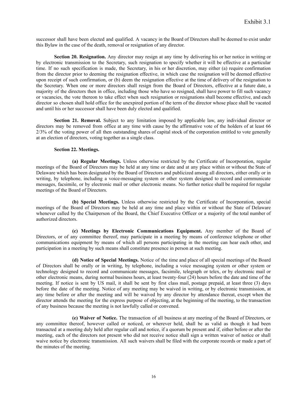 Exhibit 3.1 successor shall have been elected and qualified. A vacancy in the Board of Directors shall be deemed to exist under this Bylaw in the case of the death, removal or resignation of any director. Section 20. Resignation. Any director may resign at any time by delivering his or her notice in writing or by electronic transmission to the Secretary, such resignation to specify whether it will be effective at a particular time. If no such specification is made, the Secretary, in his or her discretion, may either (a) require confirmation from the director prior to deeming the resignation effective, in which case the resignation will be deemed effective upon receipt of such confirmation, or (b) deem the resignation effective at the time of delivery of the resignation to the Secretary. When one or more directors shall resign from the Board of Directors, effective at a future date, a majority of the directors then in office, including those who have so resigned, shall have power to fill such vacancy or vacancies, the vote thereon to take effect when such resignation or resignations shall become effective, and each director so chosen shall hold office for the unexpired portion of the term of the director whose place shall be vacated and until his or her successor shall have been duly elected and qualified. Section 21. Removal. Subject to any limitation imposed by applicable law, any individual director or directors may be removed from office at any time with cause by the affirmative vote of the holders of at least 66 2/3% of the voting power of all then outstanding shares of capital stock of the corporation entitled to vote generally at an election of directors, voting together as a single class. Section 22. Meetings. (a) Regular Meetings. Unless otherwise restricted by the Certificate of Incorporation, regular meetings of the Board of Directors may be held at any time or date and at any place within or without the State of Delaware which has been designated by the Board of Directors and publicized among all directors, either orally or in writing, by telephone, including a voice-messaging system or other system designed to record and communicate messages, facsimile, or by electronic mail or other electronic means. No further notice shall be required for regular meetings of the Board of Directors. (b) Special Meetings. Unless otherwise restricted by the Certificate of Incorporation, special meetings of the Board of Directors may be held at any time and place within or without the State of Delaware whenever called by the Chairperson of the Board, the Chief Executive Officer or a majority of the total number of authorized directors. (c) Meetings by Electronic Communications Equipment. Any member of the Board of Directors, or of any committee thereof, may participate in a meeting by means of conference telephone or other communications equipment by means of which all persons participating in the meeting can hear each other, and participation in a meeting by such means shall constitute presence in person at such meeting. (d) Notice of Special Meetings. Notice of the time and place of all special meetings of the Board of Directors shall be orally or in writing, by telephone, including a voice messaging system or other system or technology designed to record and communicate messages, facsimile, telegraph or telex, or by electronic mail or other electronic means, during normal business hours, at least twenty-four (24) hours before the date and time of the meeting. If notice is sent by US mail, it shall be sent by first class mail, postage prepaid, at least three (3) days before the date of the meeting. Notice of any meeting may be waived in writing, or by electronic transmission, at any time before or after the meeting and will be waived by any director by attendance thereat, except when the director attends the meeting for the express purpose of objecting, at the beginning of the meeting, to the transaction of any business because the meeting is not lawfully called or convened. (e) Waiver of Notice. The transaction of all business at any meeting of the Board of Directors, or any committee thereof, however called or noticed, or wherever held, shall be as valid as though it had been transacted at a meeting duly held after regular call and notice, if a quorum be present and if, either before or after the meeting, each of the directors not present who did not receive notice shall sign a written waiver of notice or shall waive notice by electronic transmission. All such waivers shall be filed with the corporate records or made a part of the minutes of the meeting. 16