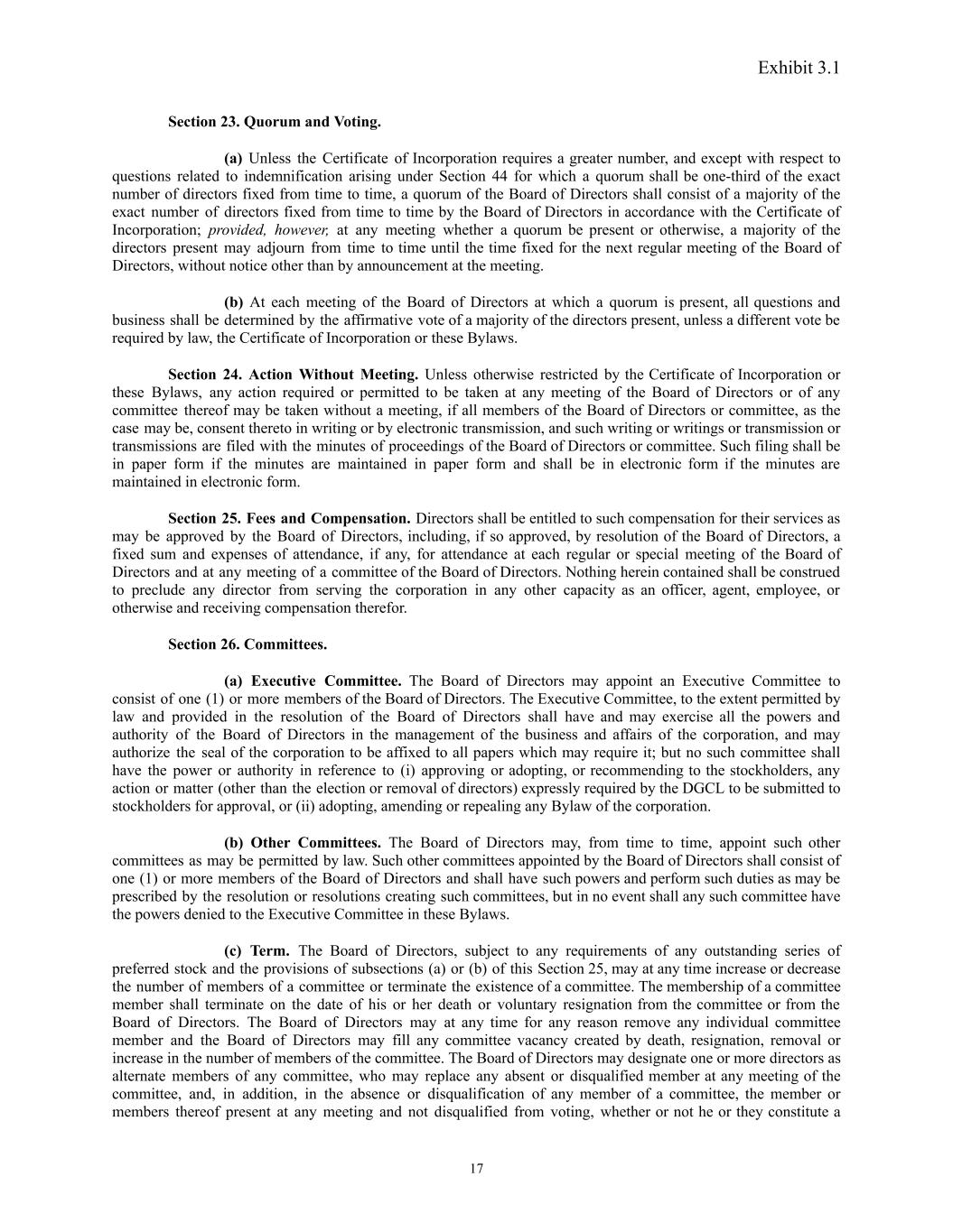 Exhibit 3.1 Section 23. Quorum and Voting. (a) Unless the Certificate of Incorporation requires a greater number, and except with respect to questions related to indemnification arising under Section 44 for which a quorum shall be one-third of the exact number of directors fixed from time to time, a quorum of the Board of Directors shall consist of a majority of the exact number of directors fixed from time to time by the Board of Directors in accordance with the Certificate of Incorporation; provided, however, at any meeting whether a quorum be present or otherwise, a majority of the directors present may adjourn from time to time until the time fixed for the next regular meeting of the Board of Directors, without notice other than by announcement at the meeting. (b) At each meeting of the Board of Directors at which a quorum is present, all questions and business shall be determined by the affirmative vote of a majority of the directors present, unless a different vote be required by law, the Certificate of Incorporation or these Bylaws. Section 24. Action Without Meeting. Unless otherwise restricted by the Certificate of Incorporation or these Bylaws, any action required or permitted to be taken at any meeting of the Board of Directors or of any committee thereof may be taken without a meeting, if all members of the Board of Directors or committee, as the case may be, consent thereto in writing or by electronic transmission, and such writing or writings or transmission or transmissions are filed with the minutes of proceedings of the Board of Directors or committee. Such filing shall be in paper form if the minutes are maintained in paper form and shall be in electronic form if the minutes are maintained in electronic form. Section 25. Fees and Compensation. Directors shall be entitled to such compensation for their services as may be approved by the Board of Directors, including, if so approved, by resolution of the Board of Directors, a fixed sum and expenses of attendance, if any, for attendance at each regular or special meeting of the Board of Directors and at any meeting of a committee of the Board of Directors. Nothing herein contained shall be construed to preclude any director from serving the corporation in any other capacity as an officer, agent, employee, or otherwise and receiving compensation therefor. Section 26. Committees. (a) Executive Committee. The Board of Directors may appoint an Executive Committee to consist of one (1) or more members of the Board of Directors. The Executive Committee, to the extent permitted by law and provided in the resolution of the Board of Directors shall have and may exercise all the powers and authority of the Board of Directors in the management of the business and affairs of the corporation, and may authorize the seal of the corporation to be affixed to all papers which may require it; but no such committee shall have the power or authority in reference to (i) approving or adopting, or recommending to the stockholders, any action or matter (other than the election or removal of directors) expressly required by the DGCL to be submitted to stockholders for approval, or (ii) adopting, amending or repealing any Bylaw of the corporation. (b) Other Committees. The Board of Directors may, from time to time, appoint such other committees as may be permitted by law. Such other committees appointed by the Board of Directors shall consist of one (1) or more members of the Board of Directors and shall have such powers and perform such duties as may be prescribed by the resolution or resolutions creating such committees, but in no event shall any such committee have the powers denied to the Executive Committee in these Bylaws. (c) Term. The Board of Directors, subject to any requirements of any outstanding series of preferred stock and the provisions of subsections (a) or (b) of this Section 25, may at any time increase or decrease the number of members of a committee or terminate the existence of a committee. The membership of a committee member shall terminate on the date of his or her death or voluntary resignation from the committee or from the Board of Directors. The Board of Directors may at any time for any reason remove any individual committee member and the Board of Directors may fill any committee vacancy created by death, resignation, removal or increase in the number of members of the committee. The Board of Directors may designate one or more directors as alternate members of any committee, who may replace any absent or disqualified member at any meeting of the committee, and, in addition, in the absence or disqualification of any member of a committee, the member or members thereof present at any meeting and not disqualified from voting, whether or not he or they constitute a 17