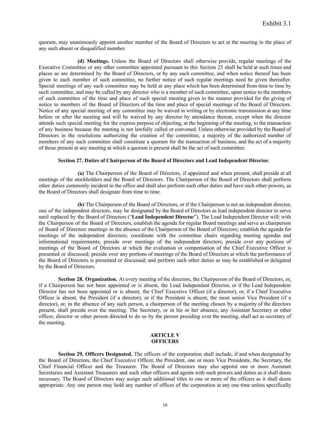 Exhibit 3.1 quorum, may unanimously appoint another member of the Board of Directors to act at the meeting in the place of any such absent or disqualified member. (d) Meetings. Unless the Board of Directors shall otherwise provide, regular meetings of the Executive Committee or any other committee appointed pursuant to this Section 25 shall be held at such times and places as are determined by the Board of Directors, or by any such committee, and when notice thereof has been given to each member of such committee, no further notice of such regular meetings need be given thereafter. Special meetings of any such committee may be held at any place which has been determined from time to time by such committee, and may be called by any director who is a member of such committee, upon notice to the members of such committee of the time and place of such special meeting given in the manner provided for the giving of notice to members of the Board of Directors of the time and place of special meetings of the Board of Directors. Notice of any special meeting of any committee may be waived in writing or by electronic transmission at any time before or after the meeting and will be waived by any director by attendance thereat, except when the director attends such special meeting for the express purpose of objecting, at the beginning of the meeting, to the transaction of any business because the meeting is not lawfully called or convened. Unless otherwise provided by the Board of Directors in the resolutions authorizing the creation of the committee, a majority of the authorized number of members of any such committee shall constitute a quorum for the transaction of business, and the act of a majority of those present at any meeting at which a quorum is present shall be the act of such committee. Section 27. Duties of Chairperson of the Board of Directors and Lead Independent Director. (a) The Chairperson of the Board of Directors, if appointed and when present, shall preside at all meetings of the stockholders and the Board of Directors. The Chairperson of the Board of Directors shall perform other duties commonly incident to the office and shall also perform such other duties and have such other powers, as the Board of Directors shall designate from time to time. (b) The Chairperson of the Board of Directors, or if the Chairperson is not an independent director, one of the independent directors, may be designated by the Board of Directors as lead independent director to serve until replaced by the Board of Directors (“Lead Independent Director”). The Lead Independent Director will: with the Chairperson of the Board of Directors, establish the agenda for regular Board meetings and serve as chairperson of Board of Directors meetings in the absence of the Chairperson of the Board of Directors; establish the agenda for meetings of the independent directors; coordinate with the committee chairs regarding meeting agendas and informational requirements; preside over meetings of the independent directors; preside over any portions of meetings of the Board of Directors at which the evaluation or compensation of the Chief Executive Officer is presented or discussed; preside over any portions of meetings of the Board of Directors at which the performance of the Board of Directors is presented or discussed; and perform such other duties as may be established or delegated by the Board of Directors. Section 28. Organization. At every meeting of the directors, the Chairperson of the Board of Directors, or, if a Chairperson has not been appointed or is absent, the Lead Independent Director, or if the Lead Independent Director has not been appointed or is absent, the Chief Executive Officer (if a director), or, if a Chief Executive Officer is absent, the President (if a director), or if the President is absent, the most senior Vice President (if a director), or, in the absence of any such person, a chairperson of the meeting chosen by a majority of the directors present, shall preside over the meeting. The Secretary, or in his or her absence, any Assistant Secretary or other officer, director or other person directed to do so by the person presiding over the meeting, shall act as secretary of the meeting. ARTICLE V OFFICERS Section 29. Officers Designated. The officers of the corporation shall include, if and when designated by the Board of Directors, the Chief Executive Officer, the President, one or more Vice Presidents, the Secretary, the Chief Financial Officer and the Treasurer. The Board of Directors may also appoint one or more Assistant Secretaries and Assistant Treasurers and such other officers and agents with such powers and duties as it shall deem necessary. The Board of Directors may assign such additional titles to one or more of the officers as it shall deem appropriate. Any one person may hold any number of offices of the corporation at any one time unless specifically 18