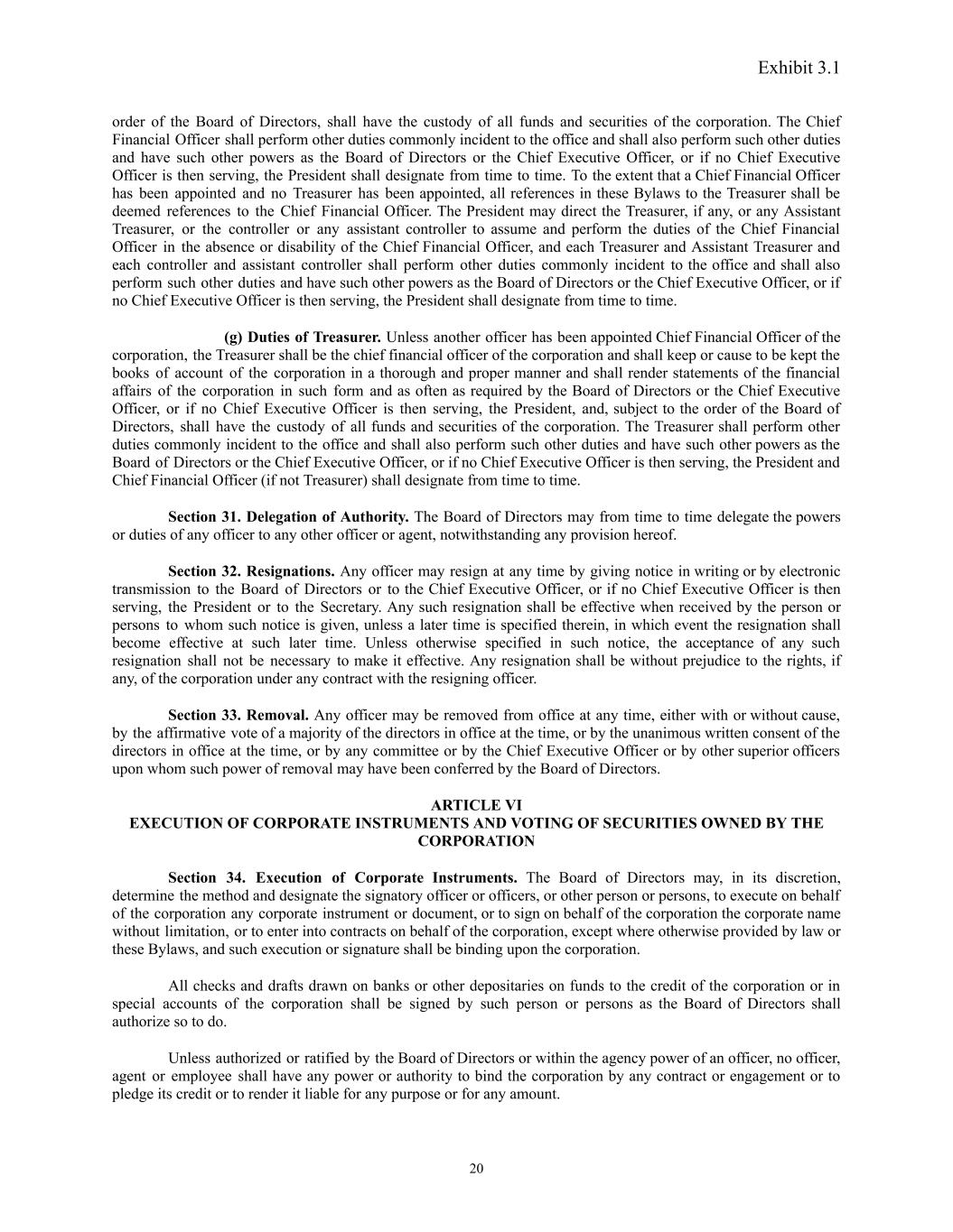 Exhibit 3.1 order of the Board of Directors, shall have the custody of all funds and securities of the corporation. The Chief Financial Officer shall perform other duties commonly incident to the office and shall also perform such other duties and have such other powers as the Board of Directors or the Chief Executive Officer, or if no Chief Executive Officer is then serving, the President shall designate from time to time. To the extent that a Chief Financial Officer has been appointed and no Treasurer has been appointed, all references in these Bylaws to the Treasurer shall be deemed references to the Chief Financial Officer. The President may direct the Treasurer, if any, or any Assistant Treasurer, or the controller or any assistant controller to assume and perform the duties of the Chief Financial Officer in the absence or disability of the Chief Financial Officer, and each Treasurer and Assistant Treasurer and each controller and assistant controller shall perform other duties commonly incident to the office and shall also perform such other duties and have such other powers as the Board of Directors or the Chief Executive Officer, or if no Chief Executive Officer is then serving, the President shall designate from time to time. (g) Duties of Treasurer. Unless another officer has been appointed Chief Financial Officer of the corporation, the Treasurer shall be the chief financial officer of the corporation and shall keep or cause to be kept the books of account of the corporation in a thorough and proper manner and shall render statements of the financial affairs of the corporation in such form and as often as required by the Board of Directors or the Chief Executive Officer, or if no Chief Executive Officer is then serving, the President, and, subject to the order of the Board of Directors, shall have the custody of all funds and securities of the corporation. The Treasurer shall perform other duties commonly incident to the office and shall also perform such other duties and have such other powers as the Board of Directors or the Chief Executive Officer, or if no Chief Executive Officer is then serving, the President and Chief Financial Officer (if not Treasurer) shall designate from time to time. Section 31. Delegation of Authority. The Board of Directors may from time to time delegate the powers or duties of any officer to any other officer or agent, notwithstanding any provision hereof. Section 32. Resignations. Any officer may resign at any time by giving notice in writing or by electronic transmission to the Board of Directors or to the Chief Executive Officer, or if no Chief Executive Officer is then serving, the President or to the Secretary. Any such resignation shall be effective when received by the person or persons to whom such notice is given, unless a later time is specified therein, in which event the resignation shall become effective at such later time. Unless otherwise specified in such notice, the acceptance of any such resignation shall not be necessary to make it effective. Any resignation shall be without prejudice to the rights, if any, of the corporation under any contract with the resigning officer. Section 33. Removal. Any officer may be removed from office at any time, either with or without cause, by the affirmative vote of a majority of the directors in office at the time, or by the unanimous written consent of the directors in office at the time, or by any committee or by the Chief Executive Officer or by other superior officers upon whom such power of removal may have been conferred by the Board of Directors. ARTICLE VI EXECUTION OF CORPORATE INSTRUMENTS AND VOTING OF SECURITIES OWNED BY THE CORPORATION Section 34. Execution of Corporate Instruments. The Board of Directors may, in its discretion, determine the method and designate the signatory officer or officers, or other person or persons, to execute on behalf of the corporation any corporate instrument or document, or to sign on behalf of the corporation the corporate name without limitation, or to enter into contracts on behalf of the corporation, except where otherwise provided by law or these Bylaws, and such execution or signature shall be binding upon the corporation. All checks and drafts drawn on banks or other depositaries on funds to the credit of the corporation or in special accounts of the corporation shall be signed by such person or persons as the Board of Directors shall authorize so to do. Unless authorized or ratified by the Board of Directors or within the agency power of an officer, no officer, agent or employee shall have any power or authority to bind the corporation by any contract or engagement or to pledge its credit or to render it liable for any purpose or for any amount. 20