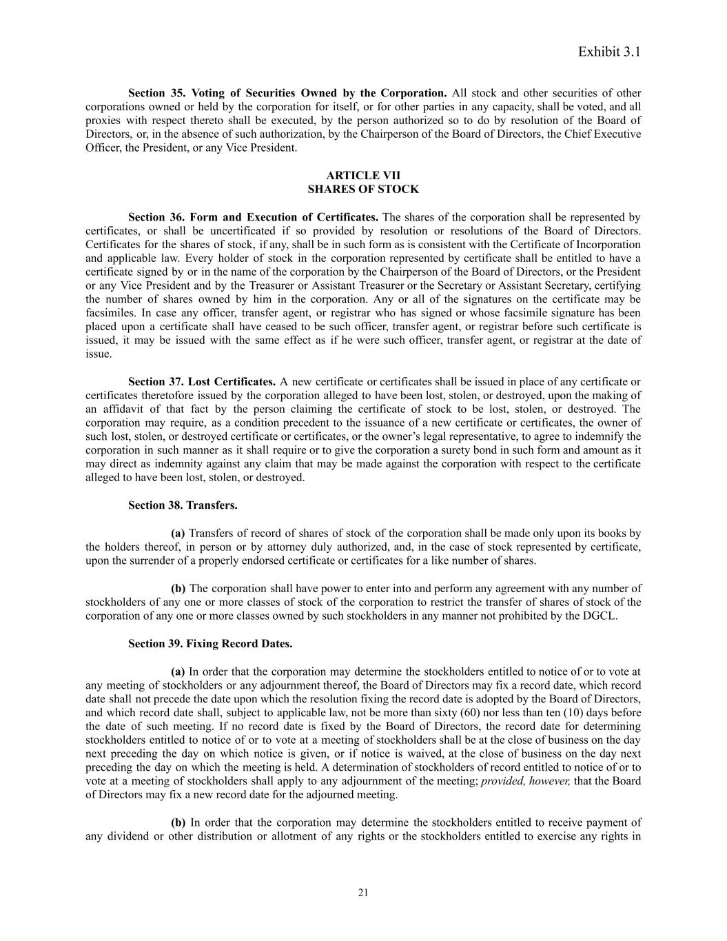 Exhibit 3.1 Section 35. Voting of Securities Owned by the Corporation. All stock and other securities of other corporations owned or held by the corporation for itself, or for other parties in any capacity, shall be voted, and all proxies with respect thereto shall be executed, by the person authorized so to do by resolution of the Board of Directors, or, in the absence of such authorization, by the Chairperson of the Board of Directors, the Chief Executive Officer, the President, or any Vice President. ARTICLE VII SHARES OF STOCK Section 36. Form and Execution of Certificates. The shares of the corporation shall be represented by certificates, or shall be uncertificated if so provided by resolution or resolutions of the Board of Directors. Certificates for the shares of stock, if any, shall be in such form as is consistent with the Certificate of Incorporation and applicable law. Every holder of stock in the corporation represented by certificate shall be entitled to have a certificate signed by or in the name of the corporation by the Chairperson of the Board of Directors, or the President or any Vice President and by the Treasurer or Assistant Treasurer or the Secretary or Assistant Secretary, certifying the number of shares owned by him in the corporation. Any or all of the signatures on the certificate may be facsimiles. In case any officer, transfer agent, or registrar who has signed or whose facsimile signature has been placed upon a certificate shall have ceased to be such officer, transfer agent, or registrar before such certificate is issued, it may be issued with the same effect as if he were such officer, transfer agent, or registrar at the date of issue. Section 37. Lost Certificates. A new certificate or certificates shall be issued in place of any certificate or certificates theretofore issued by the corporation alleged to have been lost, stolen, or destroyed, upon the making of an affidavit of that fact by the person claiming the certificate of stock to be lost, stolen, or destroyed. The corporation may require, as a condition precedent to the issuance of a new certificate or certificates, the owner of such lost, stolen, or destroyed certificate or certificates, or the owner’s legal representative, to agree to indemnify the corporation in such manner as it shall require or to give the corporation a surety bond in such form and amount as it may direct as indemnity against any claim that may be made against the corporation with respect to the certificate alleged to have been lost, stolen, or destroyed. Section 38. Transfers. (a) Transfers of record of shares of stock of the corporation shall be made only upon its books by the holders thereof, in person or by attorney duly authorized, and, in the case of stock represented by certificate, upon the surrender of a properly endorsed certificate or certificates for a like number of shares. (b) The corporation shall have power to enter into and perform any agreement with any number of stockholders of any one or more classes of stock of the corporation to restrict the transfer of shares of stock of the corporation of any one or more classes owned by such stockholders in any manner not prohibited by the DGCL. Section 39. Fixing Record Dates. (a) In order that the corporation may determine the stockholders entitled to notice of or to vote at any meeting of stockholders or any adjournment thereof, the Board of Directors may fix a record date, which record date shall not precede the date upon which the resolution fixing the record date is adopted by the Board of Directors, and which record date shall, subject to applicable law, not be more than sixty (60) nor less than ten (10) days before the date of such meeting. If no record date is fixed by the Board of Directors, the record date for determining stockholders entitled to notice of or to vote at a meeting of stockholders shall be at the close of business on the day next preceding the day on which notice is given, or if notice is waived, at the close of business on the day next preceding the day on which the meeting is held. A determination of stockholders of record entitled to notice of or to vote at a meeting of stockholders shall apply to any adjournment of the meeting; provided, however, that the Board of Directors may fix a new record date for the adjourned meeting. (b) In order that the corporation may determine the stockholders entitled to receive payment of any dividend or other distribution or allotment of any rights or the stockholders entitled to exercise any rights in 21
