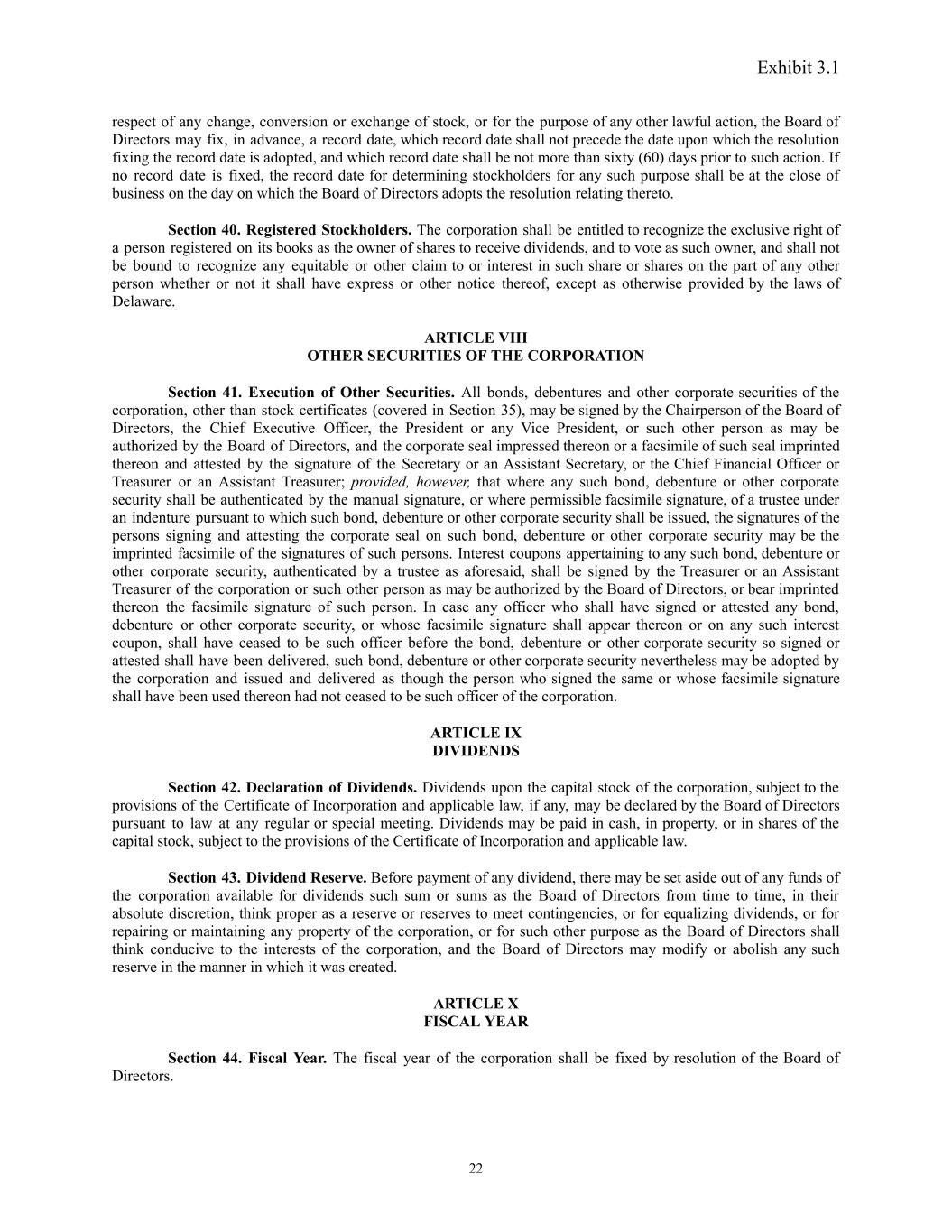 Exhibit 3.1 respect of any change, conversion or exchange of stock, or for the purpose of any other lawful action, the Board of Directors may fix, in advance, a record date, which record date shall not precede the date upon which the resolution fixing the record date is adopted, and which record date shall be not more than sixty (60) days prior to such action. If no record date is fixed, the record date for determining stockholders for any such purpose shall be at the close of business on the day on which the Board of Directors adopts the resolution relating thereto. Section 40. Registered Stockholders. The corporation shall be entitled to recognize the exclusive right of a person registered on its books as the owner of shares to receive dividends, and to vote as such owner, and shall not be bound to recognize any equitable or other claim to or interest in such share or shares on the part of any other person whether or not it shall have express or other notice thereof, except as otherwise provided by the laws of Delaware. ARTICLE VIII OTHER SECURITIES OF THE CORPORATION Section 41. Execution of Other Securities. All bonds, debentures and other corporate securities of the corporation, other than stock certificates (covered in Section 35), may be signed by the Chairperson of the Board of Directors, the Chief Executive Officer, the President or any Vice President, or such other person as may be authorized by the Board of Directors, and the corporate seal impressed thereon or a facsimile of such seal imprinted thereon and attested by the signature of the Secretary or an Assistant Secretary, or the Chief Financial Officer or Treasurer or an Assistant Treasurer; provided, however, that where any such bond, debenture or other corporate security shall be authenticated by the manual signature, or where permissible facsimile signature, of a trustee under an indenture pursuant to which such bond, debenture or other corporate security shall be issued, the signatures of the persons signing and attesting the corporate seal on such bond, debenture or other corporate security may be the imprinted facsimile of the signatures of such persons. Interest coupons appertaining to any such bond, debenture or other corporate security, authenticated by a trustee as aforesaid, shall be signed by the Treasurer or an Assistant Treasurer of the corporation or such other person as may be authorized by the Board of Directors, or bear imprinted thereon the facsimile signature of such person. In case any officer who shall have signed or attested any bond, debenture or other corporate security, or whose facsimile signature shall appear thereon or on any such interest coupon, shall have ceased to be such officer before the bond, debenture or other corporate security so signed or attested shall have been delivered, such bond, debenture or other corporate security nevertheless may be adopted by the corporation and issued and delivered as though the person who signed the same or whose facsimile signature shall have been used thereon had not ceased to be such officer of the corporation. ARTICLE IX DIVIDENDS Section 42. Declaration of Dividends. Dividends upon the capital stock of the corporation, subject to the provisions of the Certificate of Incorporation and applicable law, if any, may be declared by the Board of Directors pursuant to law at any regular or special meeting. Dividends may be paid in cash, in property, or in shares of the capital stock, subject to the provisions of the Certificate of Incorporation and applicable law. Section 43. Dividend Reserve. Before payment of any dividend, there may be set aside out of any funds of the corporation available for dividends such sum or sums as the Board of Directors from time to time, in their absolute discretion, think proper as a reserve or reserves to meet contingencies, or for equalizing dividends, or for repairing or maintaining any property of the corporation, or for such other purpose as the Board of Directors shall think conducive to the interests of the corporation, and the Board of Directors may modify or abolish any such reserve in the manner in which it was created. ARTICLE X FISCAL YEAR Section 44. Fiscal Year. The fiscal year of the corporation shall be fixed by resolution of the Board of Directors. 22