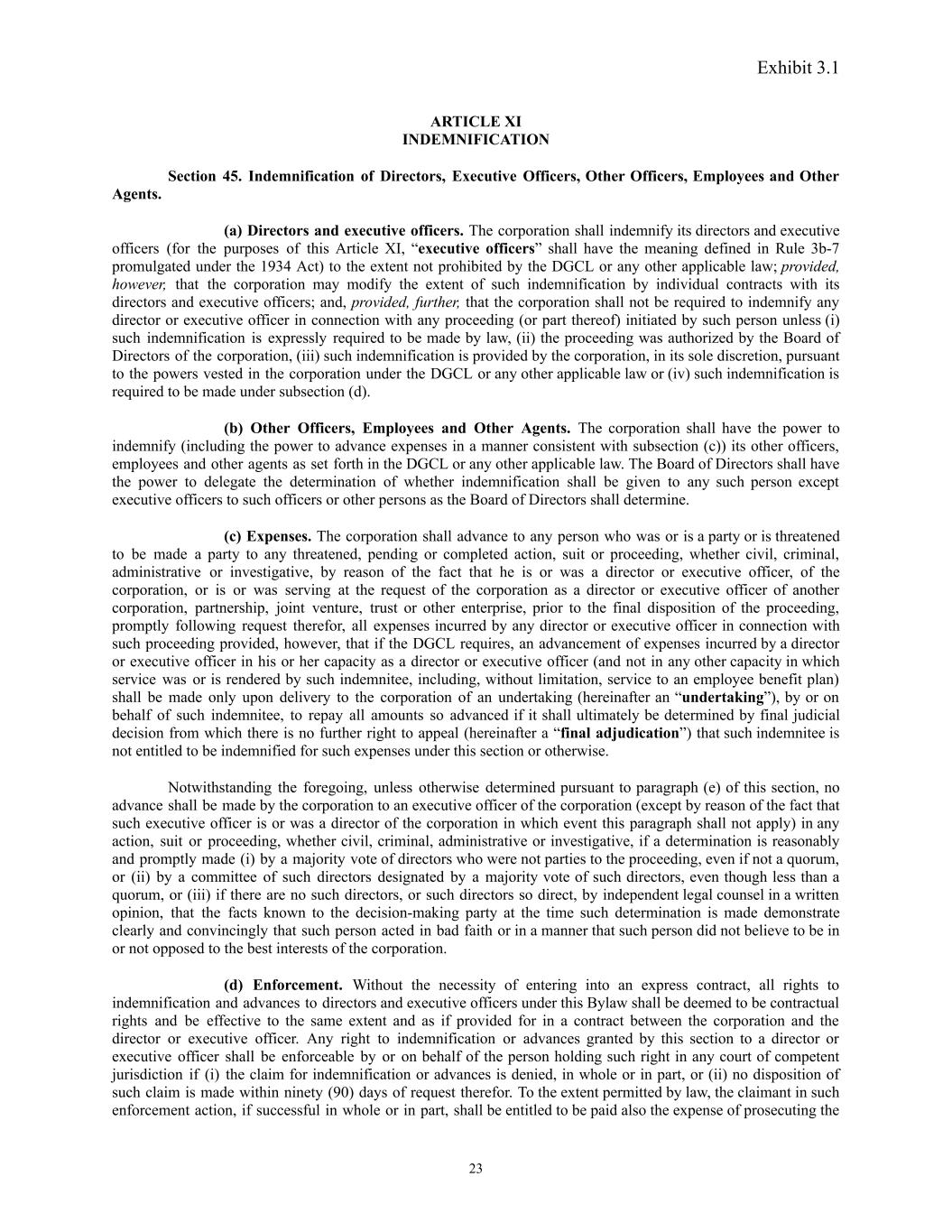 Exhibit 3.1 ARTICLE XI INDEMNIFICATION Section 45. Indemnification of Directors, Executive Officers, Other Officers, Employees and Other Agents. (a) Directors and executive officers. The corporation shall indemnify its directors and executive officers (for the purposes of this Article XI, “executive officers” shall have the meaning defined in Rule 3b-7 promulgated under the 1934 Act) to the extent not prohibited by the DGCL or any other applicable law; provided, however, that the corporation may modify the extent of such indemnification by individual contracts with its directors and executive officers; and, provided, further, that the corporation shall not be required to indemnify any director or executive officer in connection with any proceeding (or part thereof) initiated by such person unless (i) such indemnification is expressly required to be made by law, (ii) the proceeding was authorized by the Board of Directors of the corporation, (iii) such indemnification is provided by the corporation, in its sole discretion, pursuant to the powers vested in the corporation under the DGCL or any other applicable law or (iv) such indemnification is required to be made under subsection (d). (b) Other Officers, Employees and Other Agents. The corporation shall have the power to indemnify (including the power to advance expenses in a manner consistent with subsection (c)) its other officers, employees and other agents as set forth in the DGCL or any other applicable law. The Board of Directors shall have the power to delegate the determination of whether indemnification shall be given to any such person except executive officers to such officers or other persons as the Board of Directors shall determine. (c) Expenses. The corporation shall advance to any person who was or is a party or is threatened to be made a party to any threatened, pending or completed action, suit or proceeding, whether civil, criminal, administrative or investigative, by reason of the fact that he is or was a director or executive officer, of the corporation, or is or was serving at the request of the corporation as a director or executive officer of another corporation, partnership, joint venture, trust or other enterprise, prior to the final disposition of the proceeding, promptly following request therefor, all expenses incurred by any director or executive officer in connection with such proceeding provided, however, that if the DGCL requires, an advancement of expenses incurred by a director or executive officer in his or her capacity as a director or executive officer (and not in any other capacity in which service was or is rendered by such indemnitee, including, without limitation, service to an employee benefit plan) shall be made only upon delivery to the corporation of an undertaking (hereinafter an “undertaking”), by or on behalf of such indemnitee, to repay all amounts so advanced if it shall ultimately be determined by final judicial decision from which there is no further right to appeal (hereinafter a “final adjudication”) that such indemnitee is not entitled to be indemnified for such expenses under this section or otherwise. Notwithstanding the foregoing, unless otherwise determined pursuant to paragraph (e) of this section, no advance shall be made by the corporation to an executive officer of the corporation (except by reason of the fact that such executive officer is or was a director of the corporation in which event this paragraph shall not apply) in any action, suit or proceeding, whether civil, criminal, administrative or investigative, if a determination is reasonably and promptly made (i) by a majority vote of directors who were not parties to the proceeding, even if not a quorum, or (ii) by a committee of such directors designated by a majority vote of such directors, even though less than a quorum, or (iii) if there are no such directors, or such directors so direct, by independent legal counsel in a written opinion, that the facts known to the decision-making party at the time such determination is made demonstrate clearly and convincingly that such person acted in bad faith or in a manner that such person did not believe to be in or not opposed to the best interests of the corporation. (d) Enforcement. Without the necessity of entering into an express contract, all rights to indemnification and advances to directors and executive officers under this Bylaw shall be deemed to be contractual rights and be effective to the same extent and as if provided for in a contract between the corporation and the director or executive officer. Any right to indemnification or advances granted by this section to a director or executive officer shall be enforceable by or on behalf of the person holding such right in any court of competent jurisdiction if (i) the claim for indemnification or advances is denied, in whole or in part, or (ii) no disposition of such claim is made within ninety (90) days of request therefor. To the extent permitted by law, the claimant in such enforcement action, if successful in whole or in part, shall be entitled to be paid also the expense of prosecuting the 23