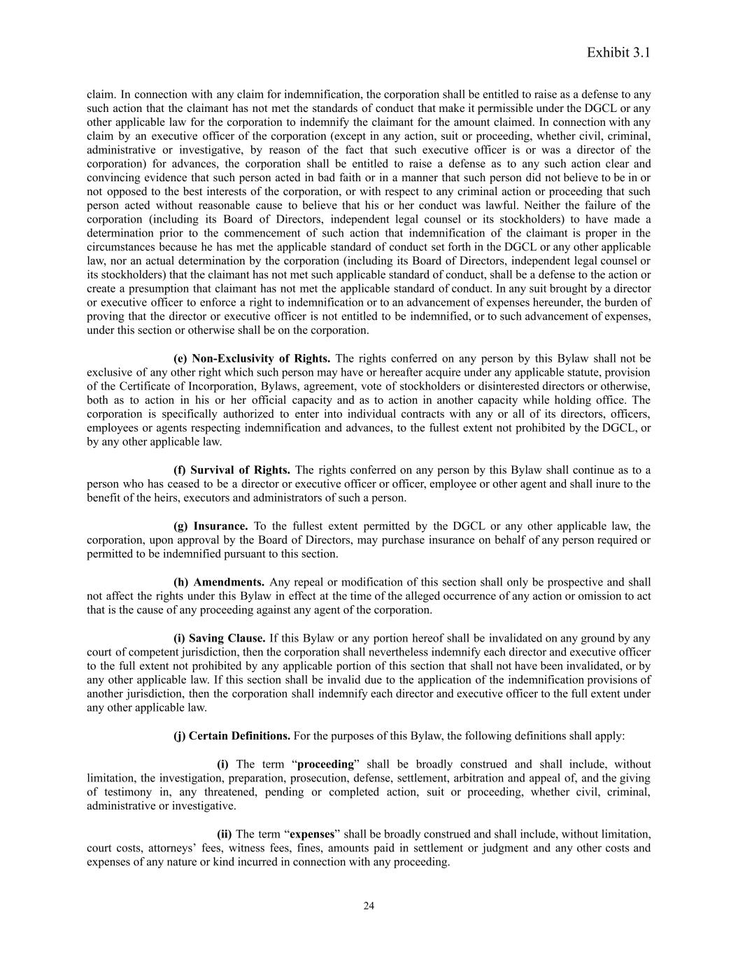 Exhibit 3.1 claim. In connection with any claim for indemnification, the corporation shall be entitled to raise as a defense to any such action that the claimant has not met the standards of conduct that make it permissible under the DGCL or any other applicable law for the corporation to indemnify the claimant for the amount claimed. In connection with any claim by an executive officer of the corporation (except in any action, suit or proceeding, whether civil, criminal, administrative or investigative, by reason of the fact that such executive officer is or was a director of the corporation) for advances, the corporation shall be entitled to raise a defense as to any such action clear and convincing evidence that such person acted in bad faith or in a manner that such person did not believe to be in or not opposed to the best interests of the corporation, or with respect to any criminal action or proceeding that such person acted without reasonable cause to believe that his or her conduct was lawful. Neither the failure of the corporation (including its Board of Directors, independent legal counsel or its stockholders) to have made a determination prior to the commencement of such action that indemnification of the claimant is proper in the circumstances because he has met the applicable standard of conduct set forth in the DGCL or any other applicable law, nor an actual determination by the corporation (including its Board of Directors, independent legal counsel or its stockholders) that the claimant has not met such applicable standard of conduct, shall be a defense to the action or create a presumption that claimant has not met the applicable standard of conduct. In any suit brought by a director or executive officer to enforce a right to indemnification or to an advancement of expenses hereunder, the burden of proving that the director or executive officer is not entitled to be indemnified, or to such advancement of expenses, under this section or otherwise shall be on the corporation. (e) Non-Exclusivity of Rights. The rights conferred on any person by this Bylaw shall not be exclusive of any other right which such person may have or hereafter acquire under any applicable statute, provision of the Certificate of Incorporation, Bylaws, agreement, vote of stockholders or disinterested directors or otherwise, both as to action in his or her official capacity and as to action in another capacity while holding office. The corporation is specifically authorized to enter into individual contracts with any or all of its directors, officers, employees or agents respecting indemnification and advances, to the fullest extent not prohibited by the DGCL, or by any other applicable law. (f) Survival of Rights. The rights conferred on any person by this Bylaw shall continue as to a person who has ceased to be a director or executive officer or officer, employee or other agent and shall inure to the benefit of the heirs, executors and administrators of such a person. (g) Insurance. To the fullest extent permitted by the DGCL or any other applicable law, the corporation, upon approval by the Board of Directors, may purchase insurance on behalf of any person required or permitted to be indemnified pursuant to this section. (h) Amendments. Any repeal or modification of this section shall only be prospective and shall not affect the rights under this Bylaw in effect at the time of the alleged occurrence of any action or omission to act that is the cause of any proceeding against any agent of the corporation. (i) Saving Clause. If this Bylaw or any portion hereof shall be invalidated on any ground by any court of competent jurisdiction, then the corporation shall nevertheless indemnify each director and executive officer to the full extent not prohibited by any applicable portion of this section that shall not have been invalidated, or by any other applicable law. If this section shall be invalid due to the application of the indemnification provisions of another jurisdiction, then the corporation shall indemnify each director and executive officer to the full extent under any other applicable law. (j) Certain Definitions. For the purposes of this Bylaw, the following definitions shall apply: (i) The term “proceeding” shall be broadly construed and shall include, without limitation, the investigation, preparation, prosecution, defense, settlement, arbitration and appeal of, and the giving of testimony in, any threatened, pending or completed action, suit or proceeding, whether civil, criminal, administrative or investigative. (ii) The term “expenses” shall be broadly construed and shall include, without limitation, court costs, attorneys’ fees, witness fees, fines, amounts paid in settlement or judgment and any other costs and expenses of any nature or kind incurred in connection with any proceeding. 24