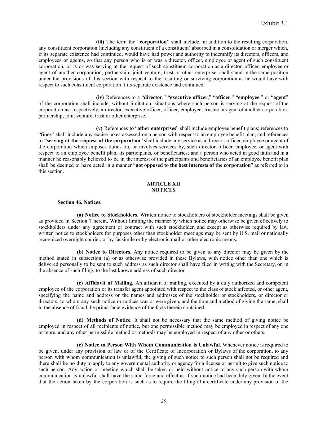 Exhibit 3.1 (iii) The term the “corporation” shall include, in addition to the resulting corporation, any constituent corporation (including any constituent of a constituent) absorbed in a consolidation or merger which, if its separate existence had continued, would have had power and authority to indemnify its directors, officers, and employees or agents, so that any person who is or was a director, officer, employee or agent of such constituent corporation, or is or was serving at the request of such constituent corporation as a director, officer, employee or agent of another corporation, partnership, joint venture, trust or other enterprise, shall stand in the same position under the provisions of this section with respect to the resulting or surviving corporation as he would have with respect to such constituent corporation if its separate existence had continued. (iv) References to a “director,” “executive officer,” “officer,” “employee,” or “agent” of the corporation shall include, without limitation, situations where such person is serving at the request of the corporation as, respectively, a director, executive officer, officer, employee, trustee or agent of another corporation, partnership, joint venture, trust or other enterprise. (v) References to “other enterprises” shall include employee benefit plans; references to “fines” shall include any excise taxes assessed on a person with respect to an employee benefit plan; and references to “serving at the request of the corporation” shall include any service as a director, officer, employee or agent of the corporation which imposes duties on, or involves services by, such director, officer, employee, or agent with respect to an employee benefit plan, its participants, or beneficiaries; and a person who acted in good faith and in a manner he reasonably believed to be in the interest of the participants and beneficiaries of an employee benefit plan shall be deemed to have acted in a manner “not opposed to the best interests of the corporation” as referred to in this section. ARTICLE XII NOTICES Section 46. Notices. (a) Notice to Stockholders. Written notice to stockholders of stockholder meetings shall be given as provided in Section 7 herein. Without limiting the manner by which notice may otherwise be given effectively to stockholders under any agreement or contract with such stockholder, and except as otherwise required by law, written notice to stockholders for purposes other than stockholder meetings may be sent by U.S. mail or nationally recognized overnight courier, or by facsimile or by electronic mail or other electronic means. (b) Notice to Directors. Any notice required to be given to any director may be given by the method stated in subsection (a) or as otherwise provided in these Bylaws, with notice other than one which is delivered personally to be sent to such address as such director shall have filed in writing with the Secretary, or, in the absence of such filing, to the last known address of such director. (c) Affidavit of Mailing. An affidavit of mailing, executed by a duly authorized and competent employee of the corporation or its transfer agent appointed with respect to the class of stock affected, or other agent, specifying the name and address or the names and addresses of the stockholder or stockholders, or director or directors, to whom any such notice or notices was or were given, and the time and method of giving the same, shall in the absence of fraud, be prima facie evidence of the facts therein contained. (d) Methods of Notice. It shall not be necessary that the same method of giving notice be employed in respect of all recipients of notice, but one permissible method may be employed in respect of any one or more, and any other permissible method or methods may be employed in respect of any other or others. (e) Notice to Person With Whom Communication is Unlawful. Whenever notice is required to be given, under any provision of law or of the Certificate of Incorporation or Bylaws of the corporation, to any person with whom communication is unlawful, the giving of such notice to such person shall not be required and there shall be no duty to apply to any governmental authority or agency for a license or permit to give such notice to such person. Any action or meeting which shall be taken or held without notice to any such person with whom communication is unlawful shall have the same force and effect as if such notice had been duly given. In the event that the action taken by the corporation is such as to require the filing of a certificate under any provision of the 25