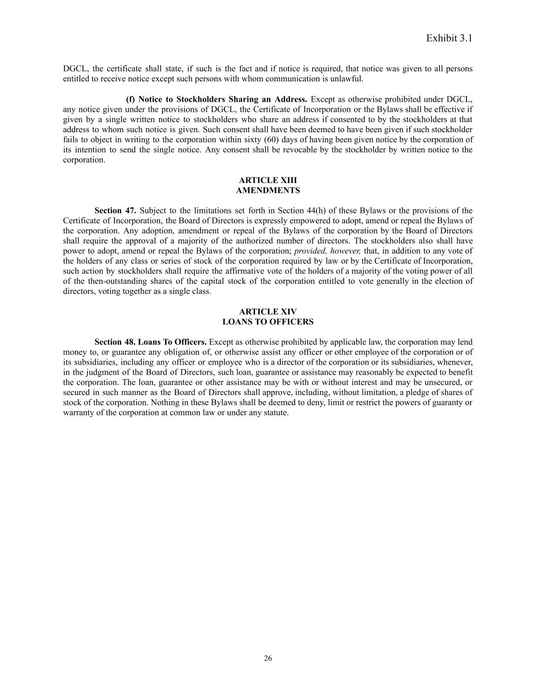 Exhibit 3.1 DGCL, the certificate shall state, if such is the fact and if notice is required, that notice was given to all persons entitled to receive notice except such persons with whom communication is unlawful. (f) Notice to Stockholders Sharing an Address. Except as otherwise prohibited under DGCL, any notice given under the provisions of DGCL, the Certificate of Incorporation or the Bylaws shall be effective if given by a single written notice to stockholders who share an address if consented to by the stockholders at that address to whom such notice is given. Such consent shall have been deemed to have been given if such stockholder fails to object in writing to the corporation within sixty (60) days of having been given notice by the corporation of its intention to send the single notice. Any consent shall be revocable by the stockholder by written notice to the corporation. ARTICLE XIII AMENDMENTS Section 47. Subject to the limitations set forth in Section 44(h) of these Bylaws or the provisions of the Certificate of Incorporation, the Board of Directors is expressly empowered to adopt, amend or repeal the Bylaws of the corporation. Any adoption, amendment or repeal of the Bylaws of the corporation by the Board of Directors shall require the approval of a majority of the authorized number of directors. The stockholders also shall have power to adopt, amend or repeal the Bylaws of the corporation; provided, however, that, in addition to any vote of the holders of any class or series of stock of the corporation required by law or by the Certificate of Incorporation, such action by stockholders shall require the affirmative vote of the holders of a majority of the voting power of all of the then-outstanding shares of the capital stock of the corporation entitled to vote generally in the election of directors, voting together as a single class. ARTICLE XIV LOANS TO OFFICERS Section 48. Loans To Officers. Except as otherwise prohibited by applicable law, the corporation may lend money to, or guarantee any obligation of, or otherwise assist any officer or other employee of the corporation or of its subsidiaries, including any officer or employee who is a director of the corporation or its subsidiaries, whenever, in the judgment of the Board of Directors, such loan, guarantee or assistance may reasonably be expected to benefit the corporation. The loan, guarantee or other assistance may be with or without interest and may be unsecured, or secured in such manner as the Board of Directors shall approve, including, without limitation, a pledge of shares of stock of the corporation. Nothing in these Bylaws shall be deemed to deny, limit or restrict the powers of guaranty or warranty of the corporation at common law or under any statute. 26