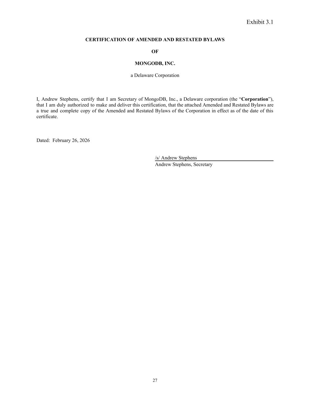 Exhibit 3.1 CERTIFICATION OF AMENDED AND RESTATED BYLAWS OF MONGODB, INC. a Delaware Corporation I, Andrew Stephens, certify that I am Secretary of MongoDB, Inc., a Delaware corporation (the “Corporation”), that I am duly authorized to make and deliver this certification, that the attached Amended and Restated Bylaws are a true and complete copy of the Amended and Restated Bylaws of the Corporation in effect as of the date of this certificate. Dated: February 26, 2026 /s/ Andrew Stephens Andrew Stephens, Secretary 27